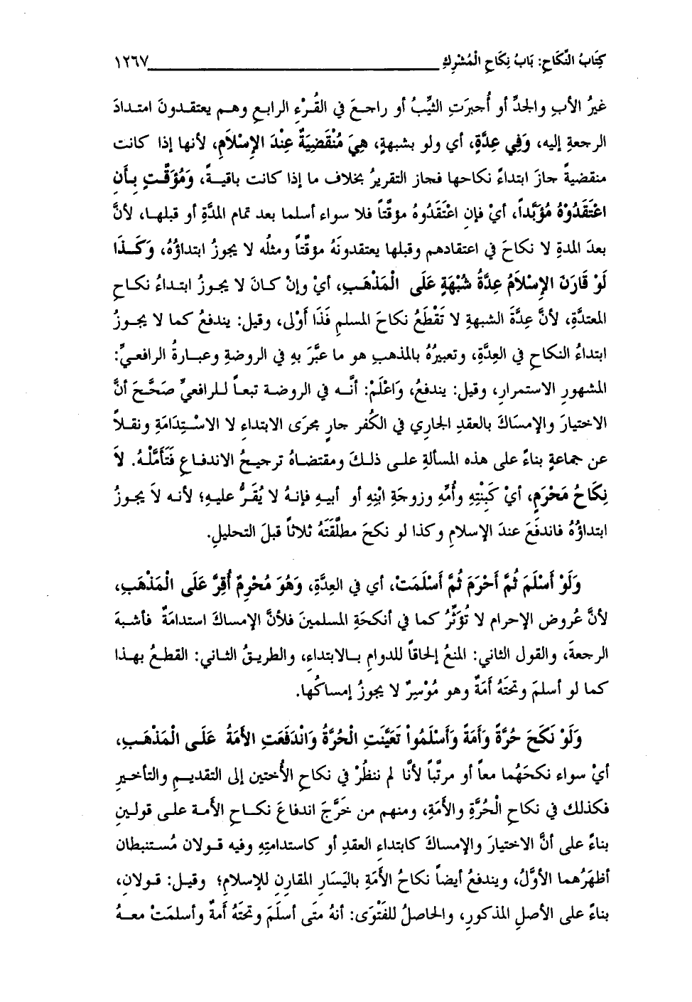 غيرُ الأبِ والجدِّ أو أُجبرَتِ الثيِّبُ أو راجعَ في القُرْء الرابعِ وهم يعتقدونَ امتدادَ الرجعةِ إليه، وَفِي عِدَّةٍ، أي ولو بشبهةٍ، هِيَ مُنْقَضِيَةٌ عِنْدَ الإِسْلاَمِ، لأنها إذا كانت منقضيةٌ جازَ ابتداءً نكاحها فجاز التقريرُ بخلاف ما إذا كانت باقيةً، وَمُؤَقَّتٍ بِأَنِ اعْتَقَدُوْهُ مُؤَبَّداً، أيْ فإنِ اعْتَقَدُوهُ مؤقَّتاً فلا سواء أسلما بعد تمام المدَّةِ أو قبلها، لأنَّ بعدَ المدةِ لا نكاحَ في اعتقادهم وقبلها يعتقدونَهُ مؤقَّتاً ومثلُه لا يجوزُ ابتداؤُهُ، وَكَذَا لَوْ قَارَنَ الإِسْلاَمُ عِدَّةُ شُبْهَةٍ عَلَى الْمَذْهَبِ، أيْ وإنْ كانَ لا يجوزُ ابتداءُ نكاحِ المعتدَّةِ، لأنَّ عِدَّةَ الشبهةِ لا تَقْطَعُ نكاحَ المسلمِ فَذَا أَوْلى، وقيل: يندفعُ كما لا يجوزُ ابتداءُ النكاحِ في العِدَّةِ، وتعبيرُهُ بالمذهبِ هو ما عبَّرَ بهِ في الروضةِ وعبارةُ الرافعيِّ: المشهورِ الاستمرارِ، وقيل: يندفعُ، وَاعْلَمْ: أنَّه في الروضة تبعاً للرافعيِّ صَحَّحَ أنَّ الاختيارَ والإمسَاكَ بالعقدِ الجارِي في الكُفر جارٍ مجرَى الابتداءِ لا الاسْتِدَامَةِ ونقلاً عن جماعةٍ بناءً على هذه المسألةِ على ذلكَ ومقتضاهُ ترجيحُ الاندفاعِ فَتَأَمَّلْهُ. لاَ نِكَاحُ مَحْرَمٍ، أيْ كَبِنْتِهِ وأُمِّهِ وزوجَةِ ابْنِهِ أو أبيهِ فإنهُ لا يُقَرُّ عليهِ؛ لأنه لاَ يجوزُ ابتداؤُهُ فاندفعَ عندَ الإسلامِ وكذا لو نكحَ مطلَّقَتَهُ ثلاثاً قبلَ التحليلِ.