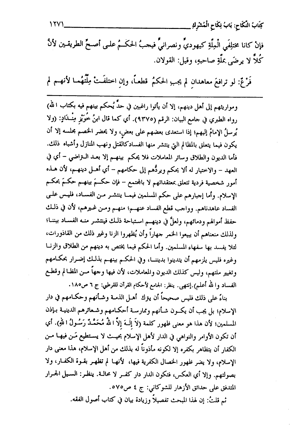 = ومواريثهم إلى أهل دينهم، إلا أن يأتوا راغبين في حدٍّ يُحكم بينهم فيه بكتاب الله) رواه الطبري في جامع البيان: الرقم (9375). أي كما قال ابنُ خُوَيْزِ مِنْدَادٍ (ولا يُرسلُ الإمامُ إليهم؛ إذا استعدى بعضهم على بعضٍ، ولا يحضر الخصم مجلسه إلا أن يكون فيما يتعلق بالمظالم التي ينتشر منها الفساد كالقتل ونهب المنازل وأشباه ذلك. فأما الديون والطلاق وسائر المعاملات فلا يحكم بينهم إلا بعد التراضى -أي في العهد- والاختيار له ألا يحكم ويردُّهم إلى حكامهم- أي أهل دينهم، لأنَّ هذه أمور شخصية فردية تتعلق بمعتقداتهم لا بالمجتمع- فإن حكمَ بينهم حكمَ بحكم الإسلام. وأما إجبارهم على حكم المسلمين فيما ينتشر من الفساد، فليس على الفساد عاهدناهم. وواجب قطع الفساد عنهم؛ منهم ومن غيرهم، لأن في ذلك حفظ أموالهم ودمائهم، ولعل في دينهم استباحة ذلك فينتشر منه الفساد بيننا؛ ولذلك منعناهم أن يبيعوا الخمر جهاراً وأن يُظهروا الزنا وغير ذلك من الفاذورات، لئلا يفسد بها سفهاء المسلمين. وأما الحكم فيما يختص به دينهم من الطلاق والزنا وغيره فليس يلزمهم أن يتدينوا بديننا، وفي الحكم بينهم بذلك إضرار بحكامهم وتغيير ملتهم، وليس كذلك الديون والمعاملات، لأن فيها وجهاً من المظالم وقطع الفساد والله أعلم). انتهى. ينظر: الجامع لأحكام القرآن للقرطبي: ج 6 ص 185.
