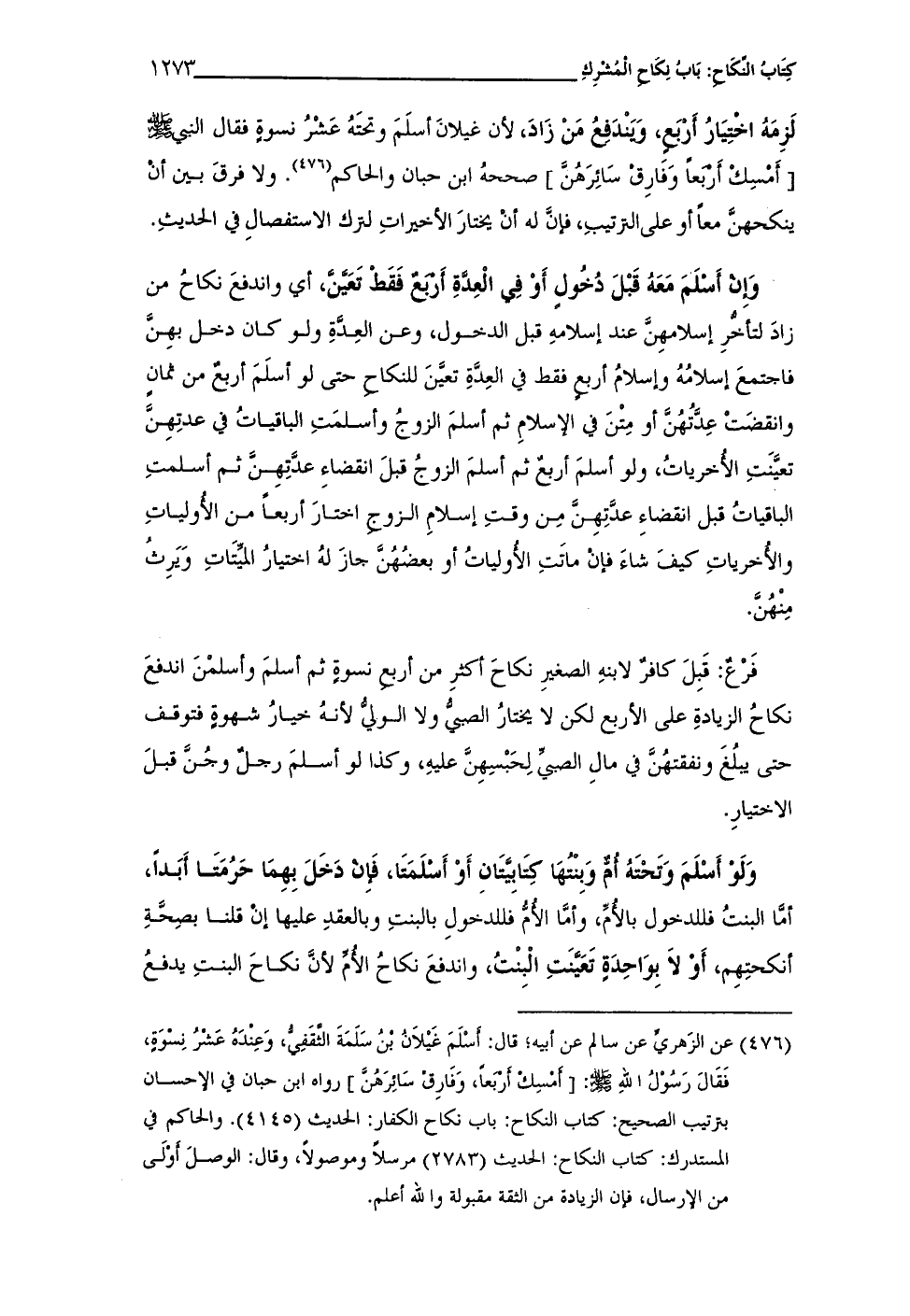 (¬476) عن الزُّهريِّ عن سالم عن أبيه؛ قال: أسْلَمَ غَيْلاَنُ بنُ سَلَمَةَ الثَّقَفِىُّ، وَعِندَهُ عَشْرُ نِسْوَةٍ، فَقَالَ رَسُولُ الله - صلى الله عليه وسلم -: [أمسِكْ أربعاً، وَفَارِقْ سَائِرَهُنَّ] رواه ابن حبان في الإحسان بترتيب الصحيح: كتاب النكاح: باب نكاح الكفار: الحديث (4145). والحاكم في المستدرك: كتاب النكاح: الحديث (2783) مرسلاً وموصولًا، وقال: الوصلَ أوْلى من الإرسال، فإن الزيادة من الثقة مقبولة والله أعلم.