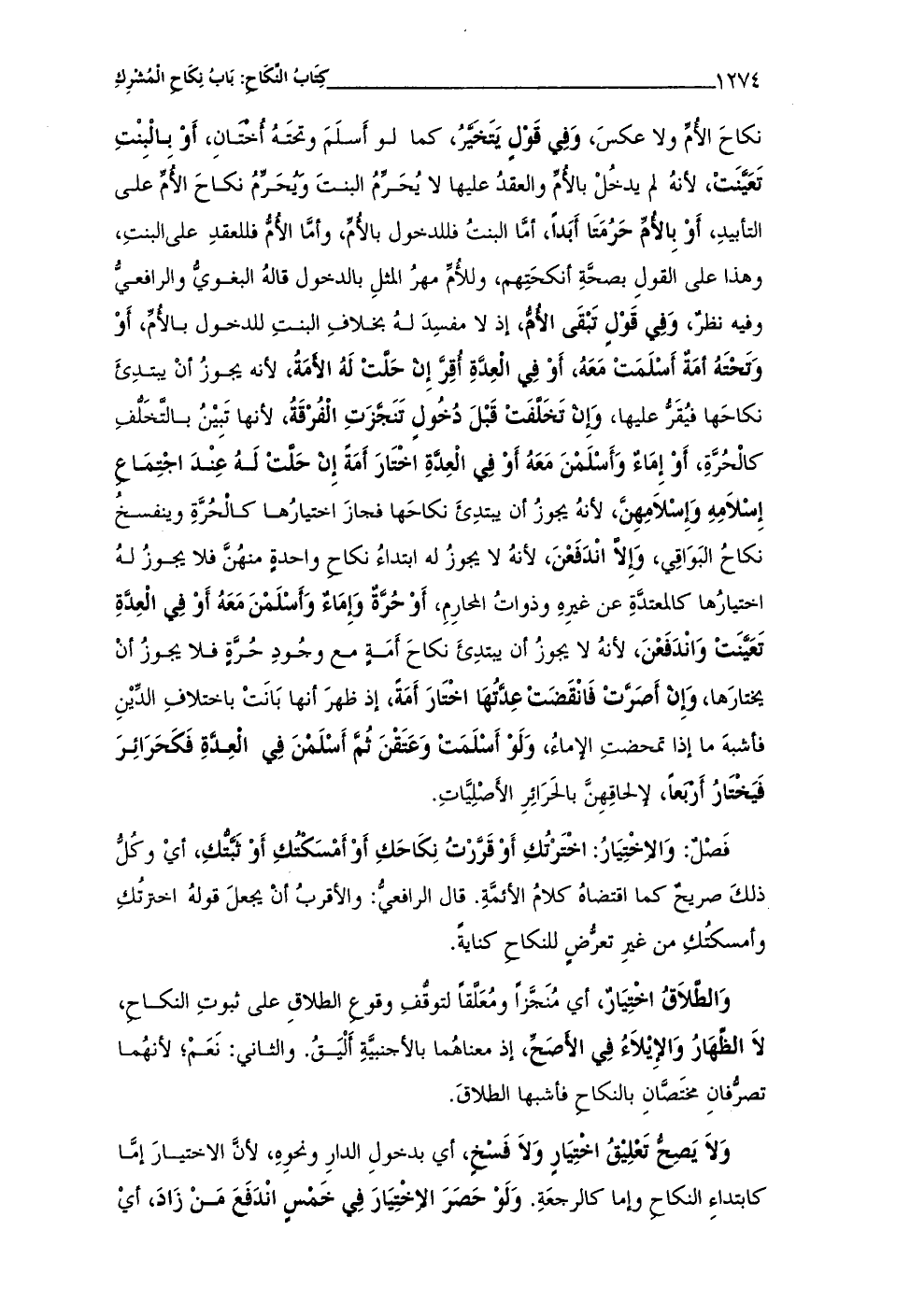 فَصلٌ: وَالاِخْتِيَارُ: اخْتَرْتُكِ أَوْ قَرَرْتُ نِكَاحَكِ أَوْ أَمسَكْتُكِ أَوْ ثَبَّتُّكِ، أيْ وكُلُّ ذلكَ صريح كما اقتضاهُ كلامُ الأئمةِ. قال الرافعىُّ: والأقربُ أنْ يجعلَ قولهُ اخترتُكِ وأمسكتك من غررِ تعرُّضٍ للنكاح كنايةً.