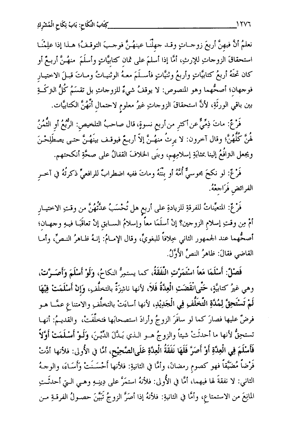 فَصْلٌ: أَسْلَمَا مَعاً اسْتَمَرَّتِ النفَقَةُ، كما يستمِرُّ النكاحُ، وَلَوْ أَسْلَمَ وَأَصَرتْ، وهى غيرُ كتابيّة، حَتى انْقَضَتِ الْعِدةُ فَلاَ، لأنها ناشِزَةٌ بالتخلُّف، وَإِن أَسْلَمَتْ فِيْها لَمْ تَسْتَحِق لِمُدَّةِ التَّخَلُّفِ فِي الْجَدِيْدِ، لأنها أساءَتْ بالتخلفِ والامتناع عمَّا هو فرضٌ عليها فصارَ كما لو سافَرَ الزوجُ وأرادَ استصحابَها فتخلفَتْ، والقديمُ: أنها تستحِق لأنها ما أحدثَتْ شيئاً والزوجُ هو الذي بَدَّلَ الدِّيْنَ، وَلَوْ أَسْلَمَتْ أَولاً فَأَسْلَمَ فِي الْعِدَّةِ أَوْ أَصرَّ فَلها نَفَقَةُ الْعِدةِ عَلَى الصحِيْح، أمَّا في الأولى: فلأنها أدَّتْ فَرضاً مُضَيَّقاً فهو كصومِ رمضانَ، وأمَّا في الثانيةِ: فلأنها أَحسَنَتْ وَأَسَاءَ، والوجهُ الثانى: لا نفقةَ لها فيهما، أمَّا في الأولى: فلأنهُ استمَرَّ على دِينِهِ وهى التي أحدثَتِ المانِعَ من الاستمتاع، وأمَّا في الثانيةِ: فلأنهُ إذا أصَرَّ الزوجُ تَبَيَّنَ حصولُ الفرقةِ من