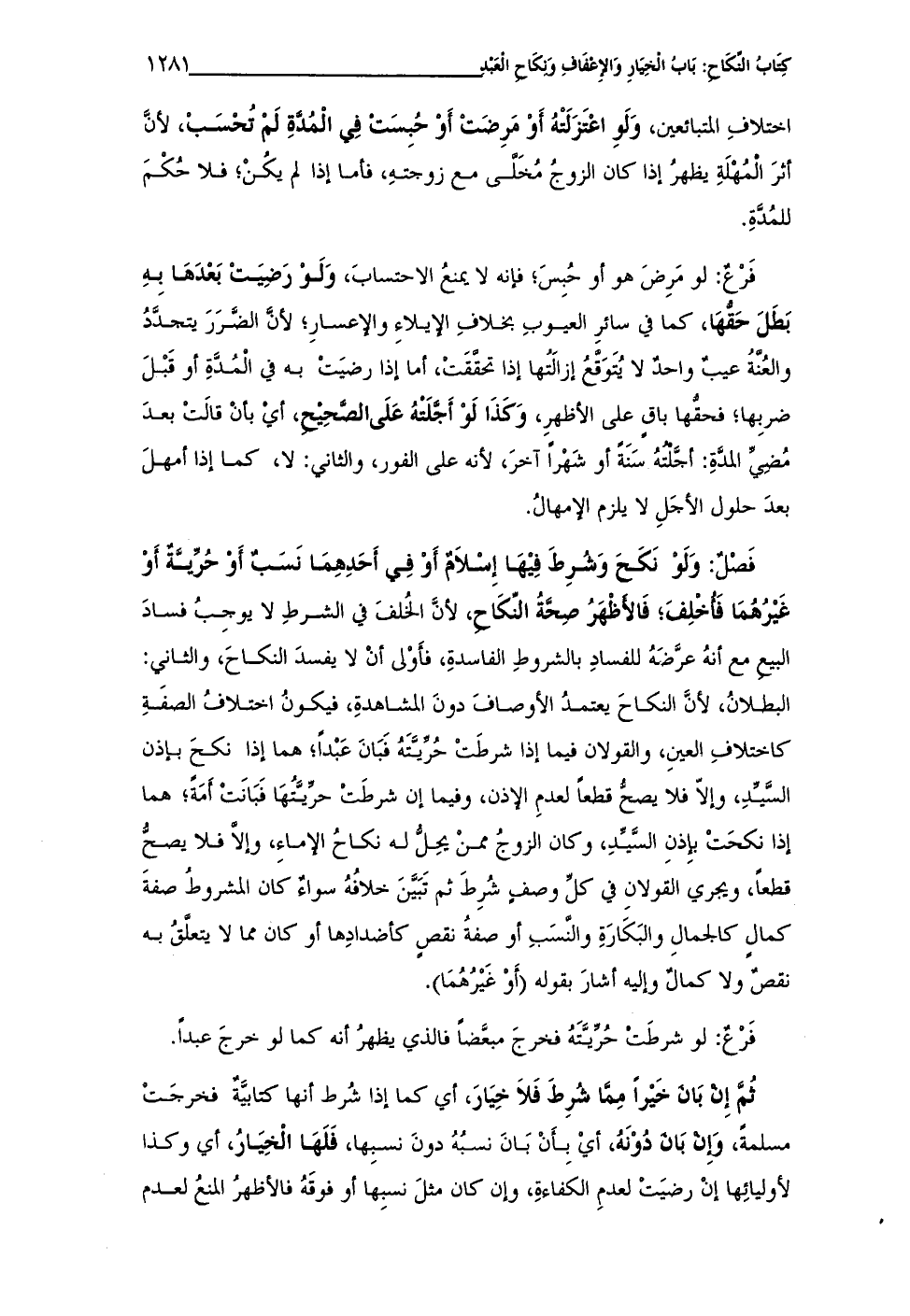 فَصْلٌ: وَلَوْ نَكَحَ وَشُرِطَ فِيْها إِسلاَم أَوْ فِي أَحَدِهِمَا نَسَبٌ أَوْ حُريةٌ أَوْ غَيْرُهُمَا فَأخْلِفَ؛ فَالأظْهرُ صِحَّةُ النِّكَاحِ، لأنَّ الخُلفَ في الشرطِ لا يوجِبُ فساد البيع مع أنهُ عرَّضه للفسادِ بالشروطِ الفاسدةِ، فأَوْلى أنْ لا يفسدَ النكاحَ، والثاني: البطلانُ، لأنَّ النكاحَ يعتمدُ الأوصافَ دونَ المشاهدةِ، فيكونُ اختلاف الصفَةِ كاختلافِ العينِ، والقولان فيما إذا شرطَتْ حُريَّتَهُ فَبَانَ عَبْداً؛ هما إذا نكحَ بإذن السيّدِ، وإلاّ فلا يصحُّ قطعاً لعدمِ الإذن، وفيما إن شرطَتْ حرّيَّتُها فَبَانت أمَةً؛ هما إذا نكحَتْ بإذنِ السَّيدِ، وكان الزوجُ ممنْ يحِلُّ له نكاحُ الإماءِ، وإلا فلا يصحُّ قطعاً، ويجري القولانِ في كلِّ وصفٍ شُرِطَ ثم تَبَيَّنَ خلافُهُ سواءٌ كان المشروطُ صفةَ كمالٍ كالجمالِ والبَكَارَةِ والنسَبِ أو صفةُ نقصٍ كأضدادِها أو كان مما لا يتعلقُ به نقصٌ ولا كمالٌ وإليه أشارَ بقوله (أَوْ غَيْرُهُمَا).