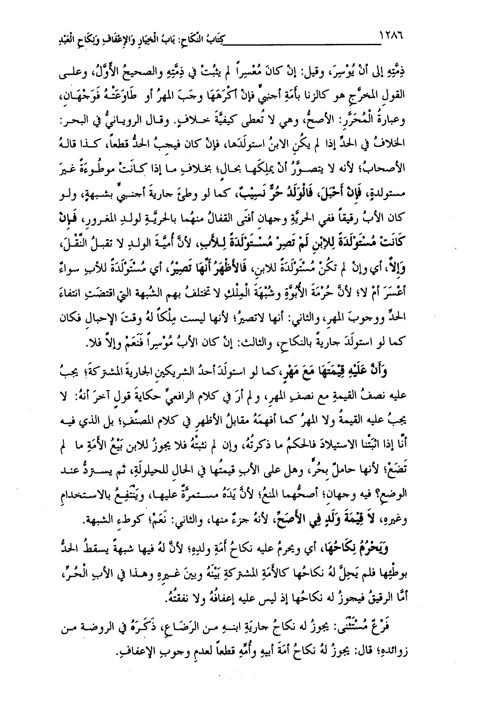 وَيَحْرُمُ نكَاحُهَا، أي ويحرمُ عليه نكاحُ أمَةِ ولدِهِ؛ لأنَّ لهُ فيها شبهةً يسقطُ الحدُّ بوطْئها فلم يَحِلَّ لهُ نكاحُها كالأمَةِ المشتركةِ بَيْنَهُ وبينَ غيرِهِ وهذا في الأبِ الْحُرِّ، أما الرقيقُ فيجوزُ له نكاحُها إذ ليس عليه إعفافُهُ ولا نفقتُهُ.