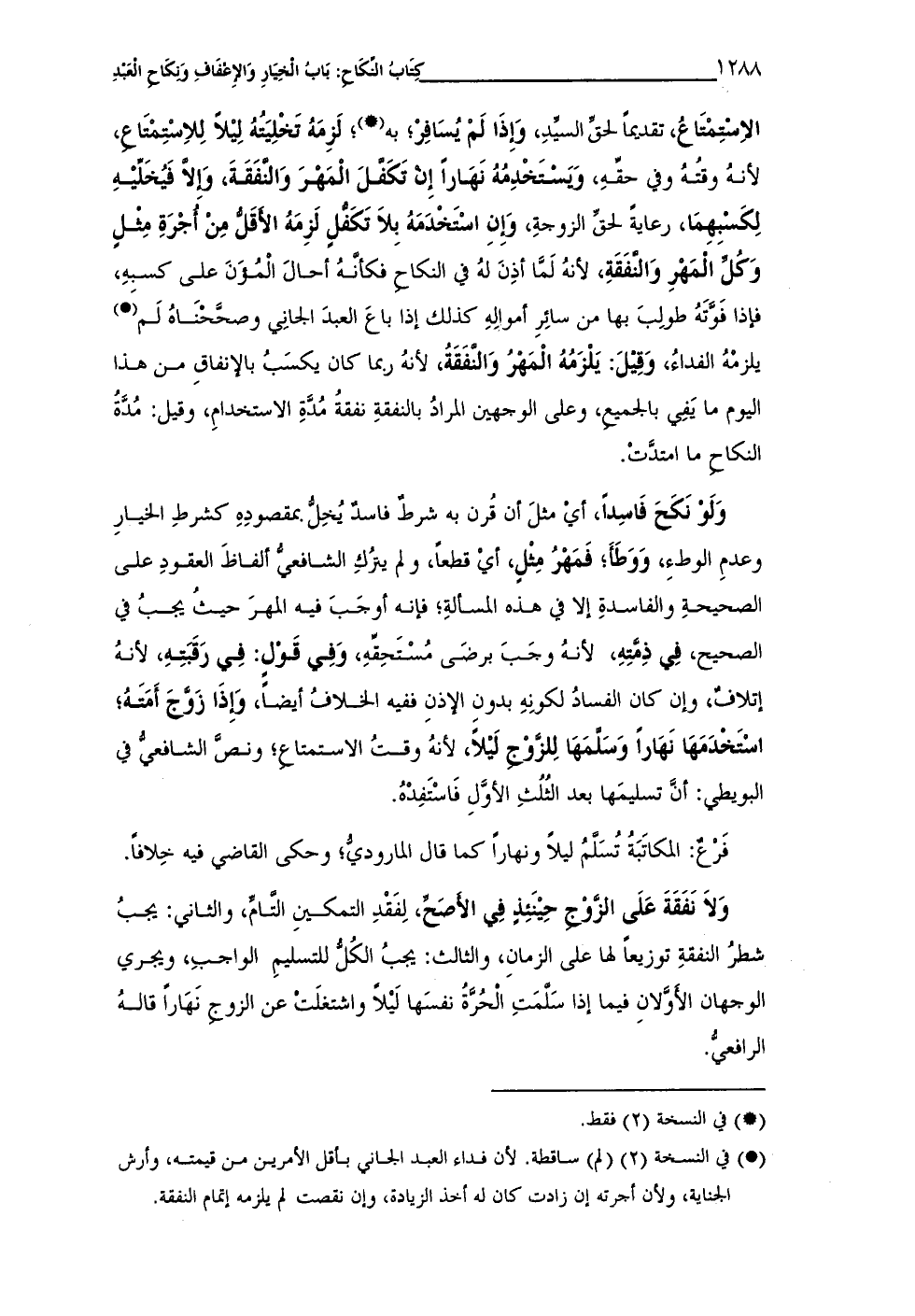 وَلَوْ نَكَحَ فَاسِداً، أي مثلَ أن قُرن به شرطٌ فاسدٌ يُخِلُّ بمقصودِهِ كشرطِ الخيارِ وعدمِ الوطءِ، وَوَطَأ، فَمَهْرُ مِثْلٍ، أيْ قطعاً، ولم يترُك الشافعى ألفاظَ العقودِ على الصحيحةِ والفاسدةِ إلا في هذه المسألةِ، فإنه أوجَبَ فيه المهرَ حيثُ يجبُ في الصحيح، فِي ذِمَّتِهِ، لأنهُ وجَبَ برضَى مُسْتَحِقِّهِ، وَفِي قَوْلٍ: فِي رَقَبَتِهِ، لأنهُ إتلافٌ، وإن كان الفسادُ لكونِهِ بدون الإذنِ ففيه الخلافُ أيضاً، وَإذَا زَوَّجَ أَمَتَهُ؛ استخْدَمَهَا نَهَاراً وَسلَّمَهَا لِلزوْج لَيْلاً، لأنهُ وقتُ الاستمتاع؛ ونصَّ الشافعى في البويطى: أنَّ تسليمَها بعد الثُّلُثِ الأوَّلِ فَاسْتَفِدْهُ.