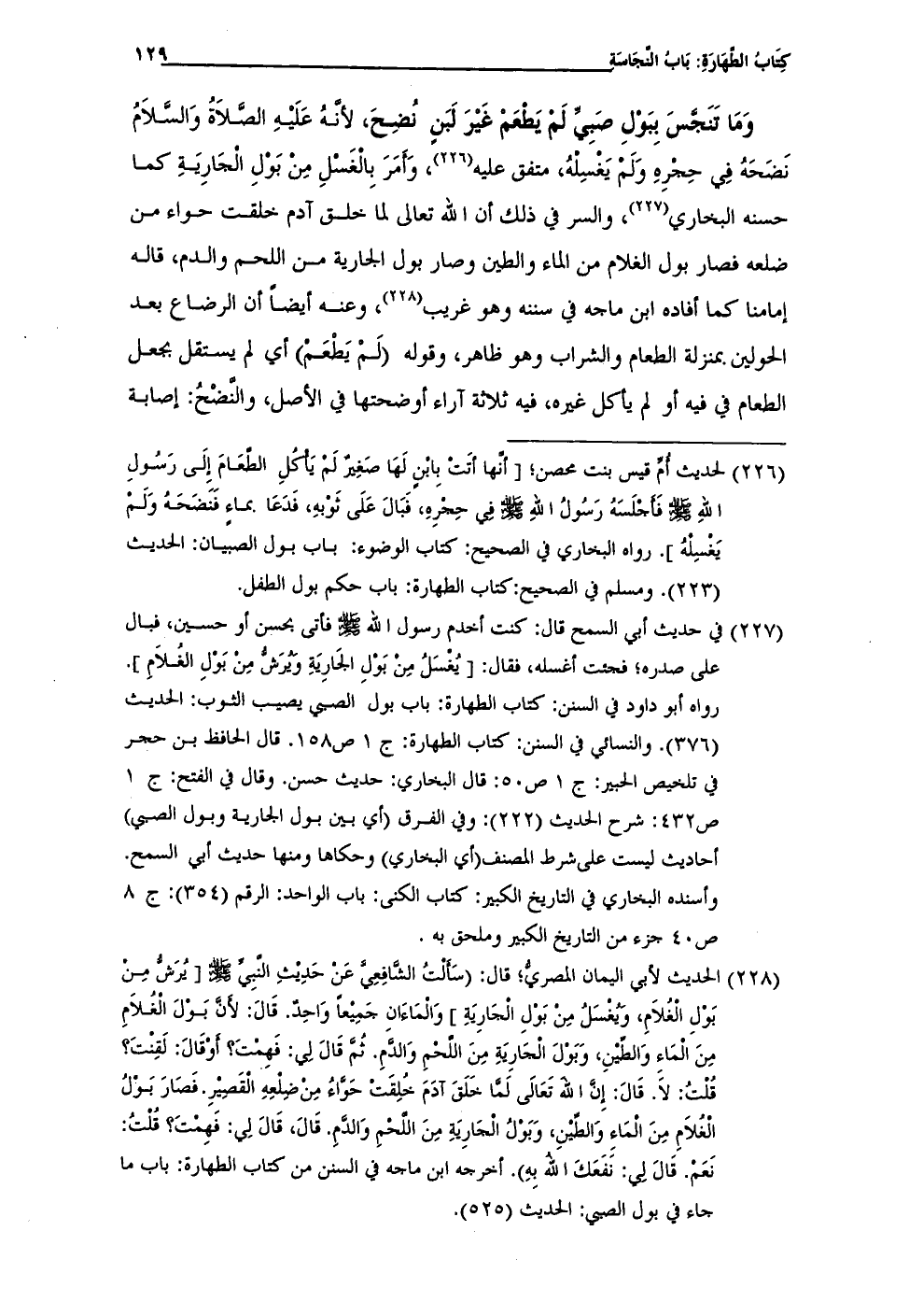 (¬226) لحديث أُمِّ قيس بنت محصن؛ [أنَّها أتَتْ بِابْنٍ لَهَا صَغِيرٌ لَمْ يَأْكُلِ الطَّعَامَ إلَى رَسُولِ اللهِ - صلى الله عليه وسلم - فَأَجْلَسَهُ رَسُولُ اللهِ - صلى الله عليه وسلم - فِي حِجْرِهِ، فَبَالَ عَلَى ثَوْبهِ، فَدَعَا بماءِ فَنَضَحَهُ وَلَمْ يَغْسِلْهُ]. رواه البخاري في الصحيح: كتاب الوضوء: باب بول الصبيان: الحديث (223). ومسلم في الصحيح: كتاب الطهارة: باب حكم بول الطفل.