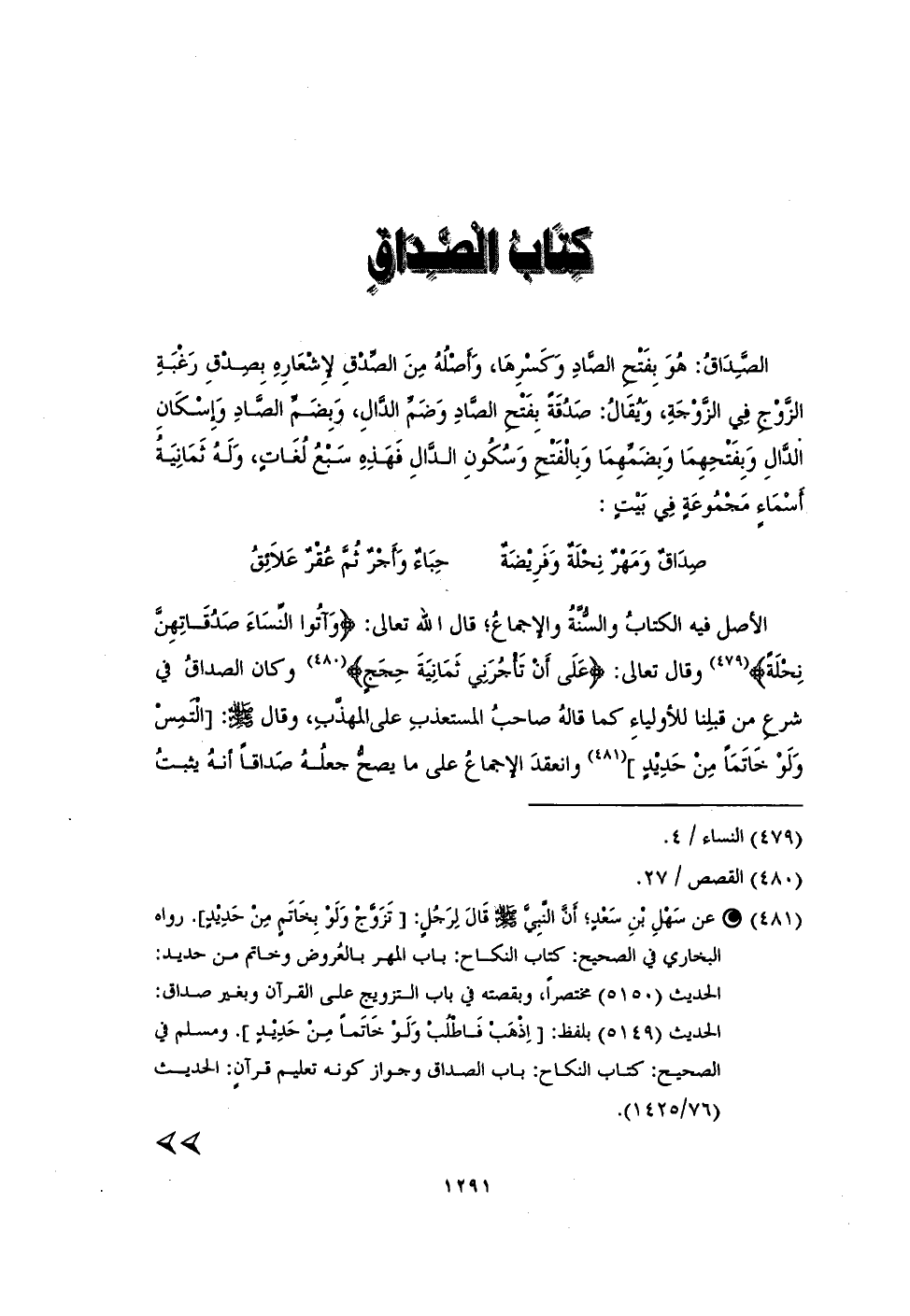 (¬481) * عن سَهلِ بنِ سَعْدٍ؛ أن النبِي - صلى الله عليه وسلم - قالَ لِرَجُلٍ: [تَزَوَّجْ وَلو بِخَاتَمِ مِنْ حدِيدٍ]. رواه البخارى في الصحيح: كتاب النكاح: باب المهر بالعُروض وخاتم من حديد: الحديث (5150) مختصراً، وبقصته في باب التزويج على القرآن وبغير صداق: الحديث (5149) بلفظ: [اِذْهَب فَاطلب وَلَو خَاتَماً مِنْ حَدِيدٍ]. ومسلم في الصحيح: كتاب النكاح: باب الصداق وجواز كونه تعليم قرآنٍ: الحديث (76/ 1425). =