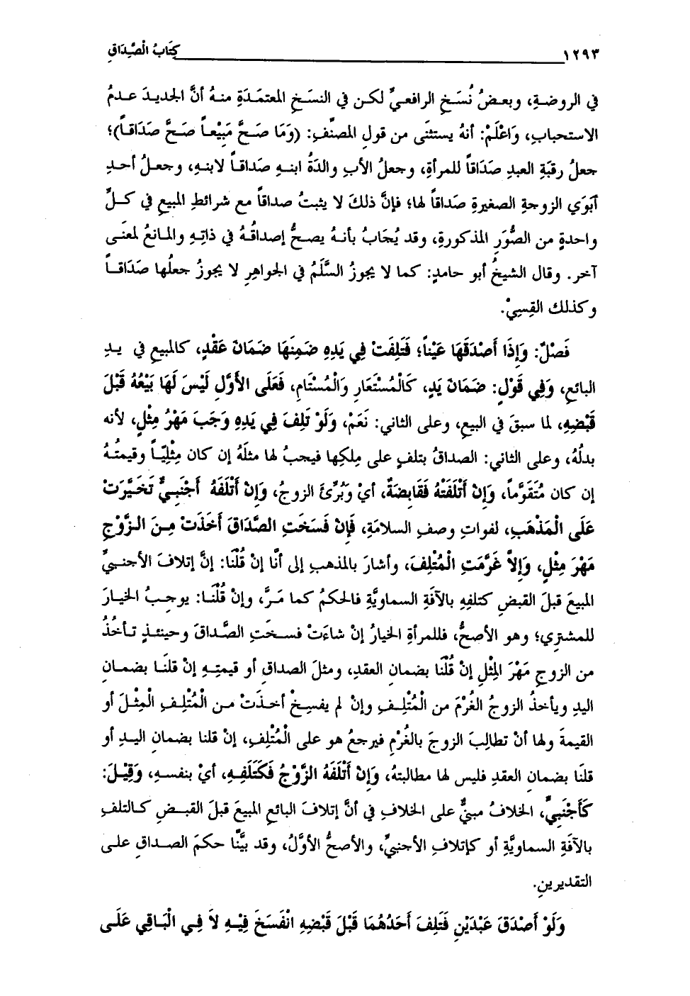 فَصْلٌ: وَإِذَا أَصْدَقَهَا عَيْناً؛ فَتَلِفَت فِي يَدِهِ ضَمِنَهَا ضَمَان عَقْدٍ، كالمبيع في يدِ البائع، وَفِي قَوْلِ: ضَمَان يَدٍ، كَالْمُسْتَعَارِ وَالْمُسْتَامِ، فَعَلَى الأَوَّلِ لَيْسَ لَهَا بَيْعُهُ قَبْلَ قَبْضِهِ، لما سبقَ في البيعِ، وعلى الثاني: نَعَمْ، وَلَوْ تَلِفَ في يَدِهِ وَجَبَ مَهْرُ مِثْلٍ، لأنه بدلُهُ، وعلى الثانى: الصداقُ بتلفٍ على مِلكِها فيجبُ لها مثلَهُ إن كان مِثْلِيًاً وقيمتُهُ إن كان مُتَقَوَّماً، وَإنْ أَتْلَفَتهُ فَقَابِضَةٌ، أيْ وَبُرِّئَ الزوجُ، وِإِن أَتْلَفَهُ أَجْنَبِيٌّ تَخَيَّرَتْ عَلَى الْمَذْهَبِ، لفواتِ وصفِ السلامَةِ، فَإِنْ فَسَخَتِ الصَّدَاقَ أَخَذَت مِنَ الزَّوْجِ مَهْرَ مِثْلٍ، وَإِلاَّ غَرَّمَتِ الْمُتْلِفَ، وأشارَ بالمذهبِ إلى أنَّا إنْ قُلْنَا: إنَّ إتلافَ الأجنبيِّ المبيعَ قبلَ القبضِ كتلفِهِ بالآفَةِ السماويَّةِ فالحكمُ كما مَرَّ، وإنْ قُلْنَا: يوجِبُ الخيارَ للمشترِي؛ وهو الأصحُّ، فللمرأةِ الخيارُ إنْ شاءَتْ فسخَتِ الصَّداقَ وحينئذٍ تأخُذُ من الزوجِ مَهْرَ المِثْلِ إن قُلْنَا بضمانِ العقدِ، ومثلَ الصداقِ أو قيمتِهِ إنْ قلنَا بضمانِ اليدِ ويأخذُ الزوجُ الغُرْمَ من الْمُتْلِفِ وإنْ لم يفسِخْ أخذَتْ من الْمُتْلِفِ الْمِثْلَ أو القيمةَ ولها أنْ تطالِبَ الزوجَ بالغُرْمِ فيرجعُ هو على الْمُتْلِفِ، إنْ قلنا بضمانِ اليدِ أو قلنَا بضمانِ العقدِ فليس لها مطالبتهُ، وَإنْ أَتْلَفَهُ الزَّوْجُ فَكَتَلَفِهِ، أيْ بنفسهِ، وَقِيلَ: كَأَجْنَبِيٍّ، الخلافُ مبنيٌّ على الخلافِ في أنَّ إتلافَ البائعِ المبيعَ قبلَ القبضِ كالتلفِ بالآفَةِ السماويَّةِ أو كإتلافِ الأجنبيِّ، والأصحُّ الأوَّلُ، وقد بيَّنّا حكمَ الصداقِ على التقديرينِ.