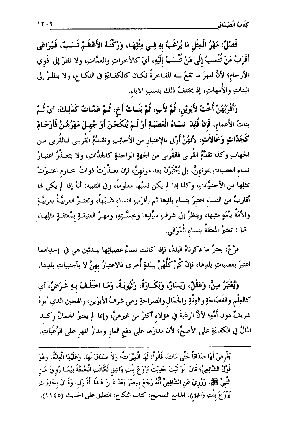 فَصْلٌ: مَهْرُ المِثلِ مَا يُرغَبُ بِهِ فِي مِثْلِهَا، وَرُكنهُ الأعْظَمُ نَسَبٌ، فَيُرَاعَى أَقْرَبُ مَن تُنْسَبُ إِلَى مَنْ تُنسَبُ إليْهِ، أيْ كالأخواتِ والعمَّاتِ، ولا نظرَ إلى ذَوِي الأرحامِ؛ لأن المهرَ ما تقعُ به المفاخرةُ فكان كالكفاءَةِ في النكاح، ولا ينظرُ إلى البناتِ والأُمهاتِ، إذ يختلفُ ذلك بنسبِ الآباءِ.