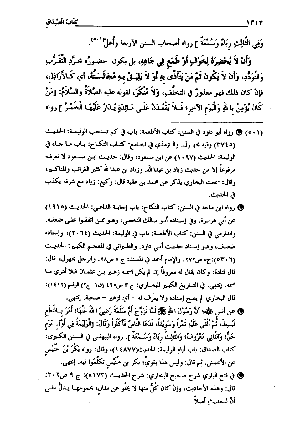 * رواه ابن ماجه في السنن: كتاب النكاح: باب إجابة الداعى: الحديث (1915) عن أبي هريرة. وفي إسناده أبو مالك النخعي، وهر ممن اتفقوا على ضعفه. والدارمى في السنن: كتاب الأطعمة: باب في الوليمة: الحديث (2064)، وإسناده ضعيف، وهو إسناد حديث أبي داود. والطبراني في المعجم الكبير: الحديث (5306): ج 5 ص 272. والإمام أحمد في المسند: ج 5 ص 28. والرجل مجهول، قال: قال قتادة: وكان يقال له معروفًا إن لم يكن اسمه زهير بن عثمان فلا أدري ما اسمه. انتهى. في التاريخ الكبير للبخاري: ج 3 ص 425 (ق 1 ج 2) الرقم (1412): قال البخاري لم يصح إسناده ولا يعرف له -أي لزهير- صحبة. انتهى.