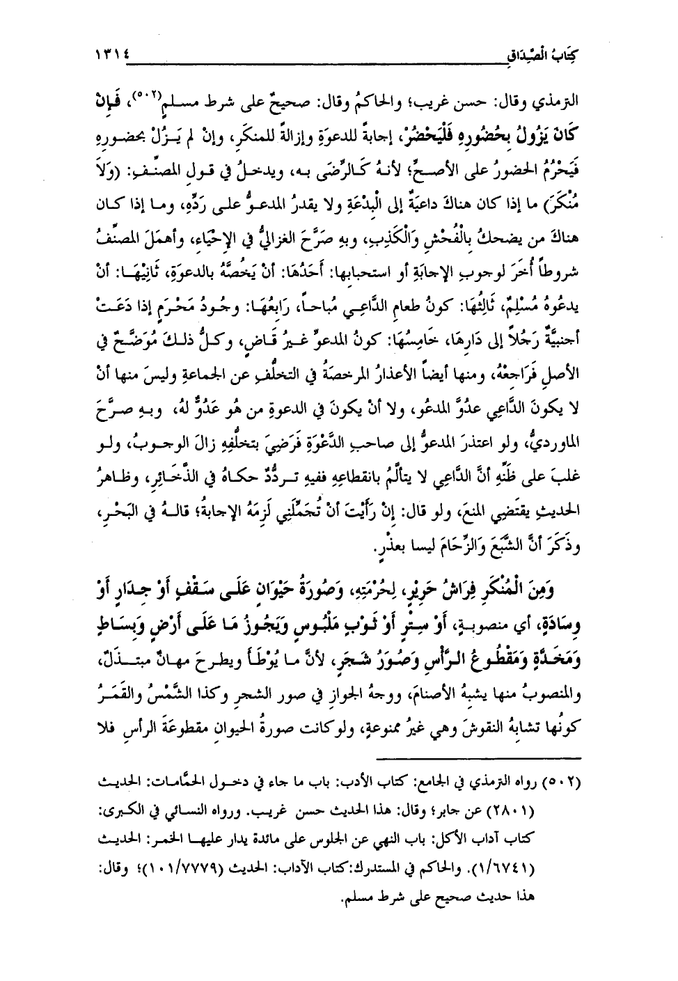 الترمذي وقال: حسن غريب؛ والحاكمُ وقال: صحيحٌ على شرط مسلمٍ (¬502)، فَإِنْ كَانَ يَزُولُ بِحُضُورِهِ فَلْيَحْضُرْ، إجابةً للدعوَةِ وإزالةً للمنكَرِ، وإنْ لم يَزُلْ بحضورِهِ فَيَحْرُمُ الحضورُ على الأصحِّ؛ لأنهُ كَالرِّضَى به، ويدخلُ في قولِ المصنِّفِ: (وَلَا مُنكَرَ) ما إذا كان هناكَ داعيَةٌ إلى الْبِدْعَةِ ولا يقدرُ المدعوُّ على رَدِّةِ، وما إذا كان هناكَ من يضحكُ بِالْفُحْشِ وَالْكَذِبِ، وبهِ صَرَّحَ الغزاليُّ في الإِحْيَاءِ، وأهمَلَ المصنِّفُ شروطًا أُخَرَ لوجوبِ الإجابَةِ أو استحبابِها: أَحَدُهَا: أنْ يَخُصَّهُ بالدعوَةِ، ثَانِيْهَا: أنْ يدعُوهُ مُسْلِمٌ، ثَالِثُهَا: كونُ طعامِ الدَّاعِي مُباحًا، رَابِعُهَا: وجُودُ مَحْرَمٍ إذا دَعَتْ أجنبيَّةٌ رَجُلًا إلى دَارِهَا، خَامِسُهَا: كونُ المدعوِّ غيرُ قَاضٍ، وكلُّ ذلكَ مُوَضَّحٌ في الأصلِ فَرَاجِعْهُ، ومنها أيضًا الأعذارُ المرخصَةُ في التخلُّفِ عن الجماعةِ وليسَ منها أنْ لا يكونَ الدَّاعِي عدُوَّ المدعُو، ولا أنْ يكونَ في الدعوةِ من هُو عَدُوٌّ لهُ، وبهِ صرَّحَ الماورديُّ، ولو اعتذرَ المدعوُّ إلى صاحبِ الدَّعْوَةِ فَرَضِيَ بتخلُّفِهِ زالَ الوجوبُ، ولو غلبَ على ظَنِّهِ أنَّ الدَّاعِي لا يتألَّمُ بانقطاعِهِ ففيهِ تردُّدٌ حكاهُ في الذَّخَائِرِ، وظاهرُ الحديثِ يقتَضي المنعَ، ولو قال: إِنْ رَأيْتَ أنْ تُحَمِّلَنِي لَزِمَهُ الإجابةُ؛ قالهُ في البَحْرِ، وذَكَرَ أنَّ الشَّبَعَ وَالزِّحَامَ ليسا بعذْرٍ.