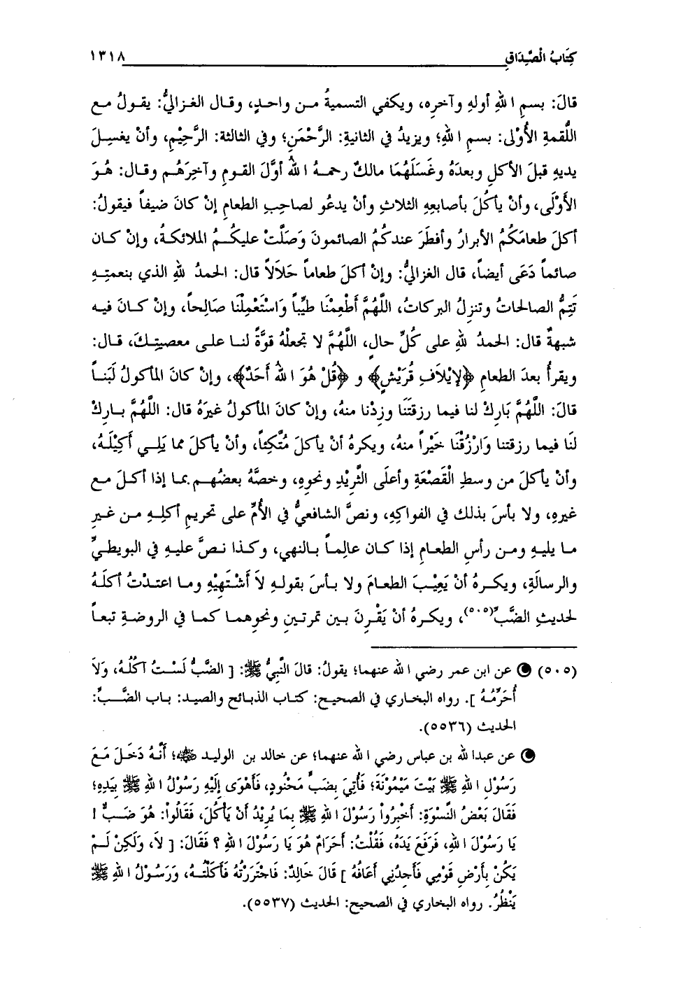 قالَ: بسمِ اللهِ أولهِ وأخرِه، ويكفى التسميةُ من واحدٍ، وقال الغزاليُّ: يقولُ مع اللُّقمةِ الأُوْلى: بسمِ اللهِ، ويزيدُ في الثانيةِ: الرَّحْمَنِ، وفي الثالثة: الرَّحِيْمِ، وأنْ يغسِلَ يديهِ قبلَ الأكلِ وبعدَهُ وغَسَلَهُمَا مالكٌ رحمهُ الله أوَّلَ القومِ وآخِرَهُم وقال: هُوَ الأَوْلَى، وأنْ يأكُلَ بأصابعِهِ الثلاثِ وأنْ يدعُو لصاحِبِ الطعامِ إنْ كانَ ضيفًا فيقولُ: أكلَ طعامَكُمُ الأبرارُ وأفطَرَ عندكُمُ الصائمونَ وَصَلَّتْ عليكُمُ الملائكةُ، وإنْ كان صائمًا دَعَى أيضًا، قال الغزاليُّ: وإنْ أكلَ طعامًا حَلَالًا قال: الحمدُ للهِ الَّذي بنعمتِهِ تَتِم الصالحاتُ وتنزِلُ البركاتُ، اللَّهُمَّ أَطْعِمْنَا طيِّبًا وَاسْتَعْمِلْنَا صَالِحًا، وإنْ كانَ فيه شبهةٌ قال: الحمدُ للهِ على كُلِّ حالٍ، اللَّهُمَّ لا تجعلْهُ قوَّةً لنا على معصِيَتكَ، قال: ويقرأ بعدَ الطعامِ {لِإِيلَافِ قُرَيْشٍ} و {قُلْ هُوَ اللَّهُ أَحَدٌ}، وإنْ كانَ المأكولُ لَبَنًا قالَ: اللَّهُمَّ بَارِكْ لنا فيما رزقتَنَا وزِدْنا منهُ، وإنْ كانَ المأكولُ غيرَهُ قال: اللَّهُم بارِكْ لنَا فيما رزقتنا وَارْزُقْنَا خَيْرًا منهُ، ويكرهُ أنْ يأكلَ مُتَّكِئًا، وأنْ يأكلَ مما يَلِي أَكِيْلَهُ، وأنْ يأكلَ من وسطِ الْقَصْعَةِ وأعلَى الثَّرِيْدِ ونحوِهِ، وخصَّهُ بعضُهم بما إذا أكلَ مع غيرهِ، ولا بأسَ بذلك في الفواكِهِ، ونصَّ الشافعىُّ في الاُمِّ على تحريمِ أكلِهِ من غيرِ ما يليهِ ومن رأسِ الطعامِ إذا كان عالِمًا بالنهي، وكذا نصَّ عليهِ في البويطيِّ والرسالَةِ، ويكرهُ أنْ يَعِيْبَ الطعامَ ولا بأسَ بقولهِ لَا أَشْتَهِيْهِ وما اعتدْتُ أكلَهُ لحديثِ الضَّبِّ (¬505)، ويكرهُ أنْ يَقْرِنَ بين تمرتينِ ونحوِهما كما في الروضةِ تبعًا