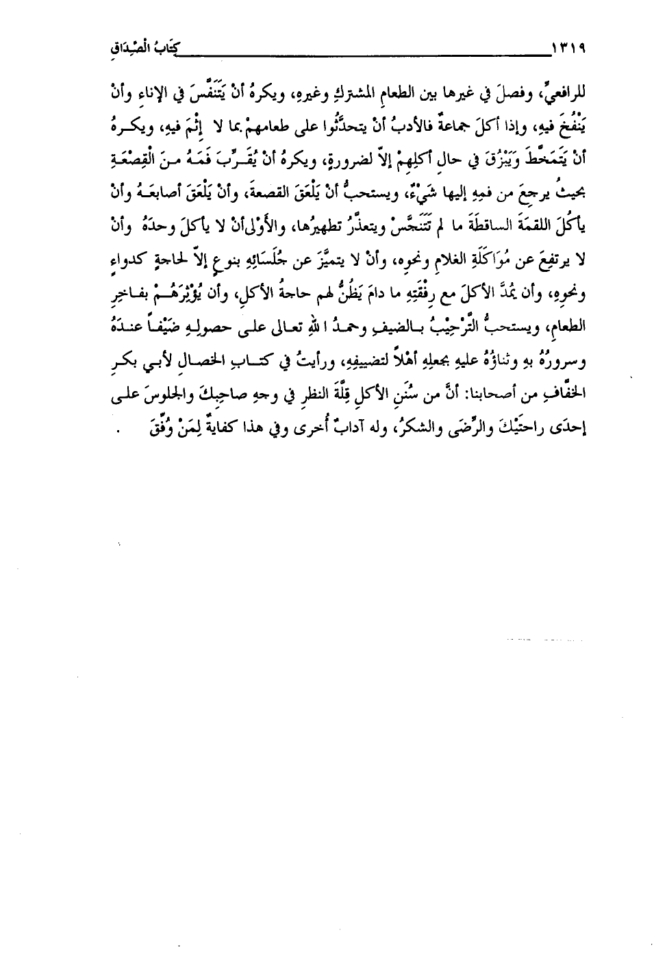 للرافعيِّ، وفصلَ في غيرها بين الطعامِ المشتركِ وغيرهِ، ويكرهُ أنْ يَتَنَفَّسَ في الإناءِ وأنْ يَنْفُخَ فيهِ، وإذا أكلَ جماعةٌ فالأدبُ أنْ يتحدَّثُوا على طعامهمْ بما لا إِثْمَ فيهِ، ويكرهُ أن يَتَمَخَّطَ وَيَبْزُقَ في حالِ أكلِهِمْ إلَّا لضرورةٍ، ويكرهُ أنْ يُقَرِّبَ فَمَهُ منَ الْقِصْعَةِ بحيثُ يرجِعَ من فمِهِ إليها شَيْءٌ، ويستحبُّ أنْ يَلْعَقَ القصعةَ، وأنْ يَلْعَقَ أصابعَهُ وأنْ يأكُلَ اللقمَةَ الساقطَةَ ما لم تَتَنجَّسْ ويتعذَّرُ تطهيرُها، والأوْلى أنْ لا يأكلَ وحدَهُ وأن لا يرتفِعَ عن مُوَاكَلَةِ الغلامِ ونحوِه، وأنْ لا يتميَّزَ عن جُلَسَائِهِ بنوعٍ إلَّا لحاجةٍ كدواءٍ ونحوِهِ، وأن يمُدَّ الأكلَ مع رِفْقَتِهِ ما دامَ يَظُنُّ لهم حاجةُ الأكلِ، وأن يُؤْثِرَهُمْ بفاخِرِ الطعامِ، ويستحبُّ التَّرحِيْبُ بالضيفِ وحمدُ اللهِ تعالى على حصولهِ ضَيْفًا عندَهُ وسرورُهُ بهِ وثناؤُهُ عليهِ يجعلِهِ أهْلًا لتضييفِهِ، ورأيتُ في كتابِ الخصالِ لأبي بكرِ الخفَّافِ من أصحابنا: أنَّ من سُنَنِ الأكلِ قِلَّةَ النظرِ في وجهِ صاحِبِكَ والجلوسَ على إحدَى راحتَيْكَ والرضى والشكرُ، وله آدابٌ أُخرى وفي هذا كفايةٌ لِمَنْ وُفِّقَ