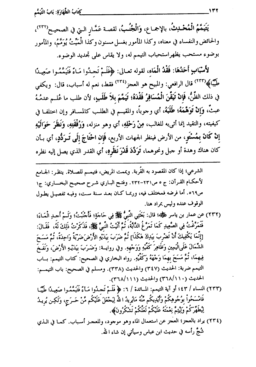لأَسْبَابٍ أَحَدُهَا: فَقْدُ الْمَاءِ، لقوله تعالى: {فَلَمْ تَجِدُوا مَاءً فَتَيَمَّمُوا صَعِيدًا طَيِّبًا} (¬233) قال الرافعي: والمبيح هو العجز (¬234) فقط، نعم له أسباب، قال: ويكفي في ذلك الظَّنُّ، فَإِنْ تَيَقَّنَ الْمُسَافِرُ فَقْدَهُ؛ تَيَمَّمَ بِلَا طَلَبٍ، لأن طلب ما عُلم عدمُهُ عبثٌ، وَإِنْ تَوَهَّمَهُ؛ طَلَبَهُ، أي وجوبًا، والمقيم في الطلب كالمسافر وإن اختلفا في كيفيته، والنَّفيد إنما أتى به للغالب، مِنْ رَحْلِهِ، أي وهو منزله، وَرُفْقَتِهِ، وَنَظَرَ حَوَالَيْهِ إِنْ كَانَ بِمُسْتَوٍ، من الأرض فينظر الجهات الأربع، فَإنِ احْتَاجَ إِلَى تَرَدُّدٍ، أي بأن كان هناك وهدة أو حبل ونحوهما، تَرَدَّدَ قَدْرَ نَظَرِهِ، أي القدر الَّذي يصل إليه نظره