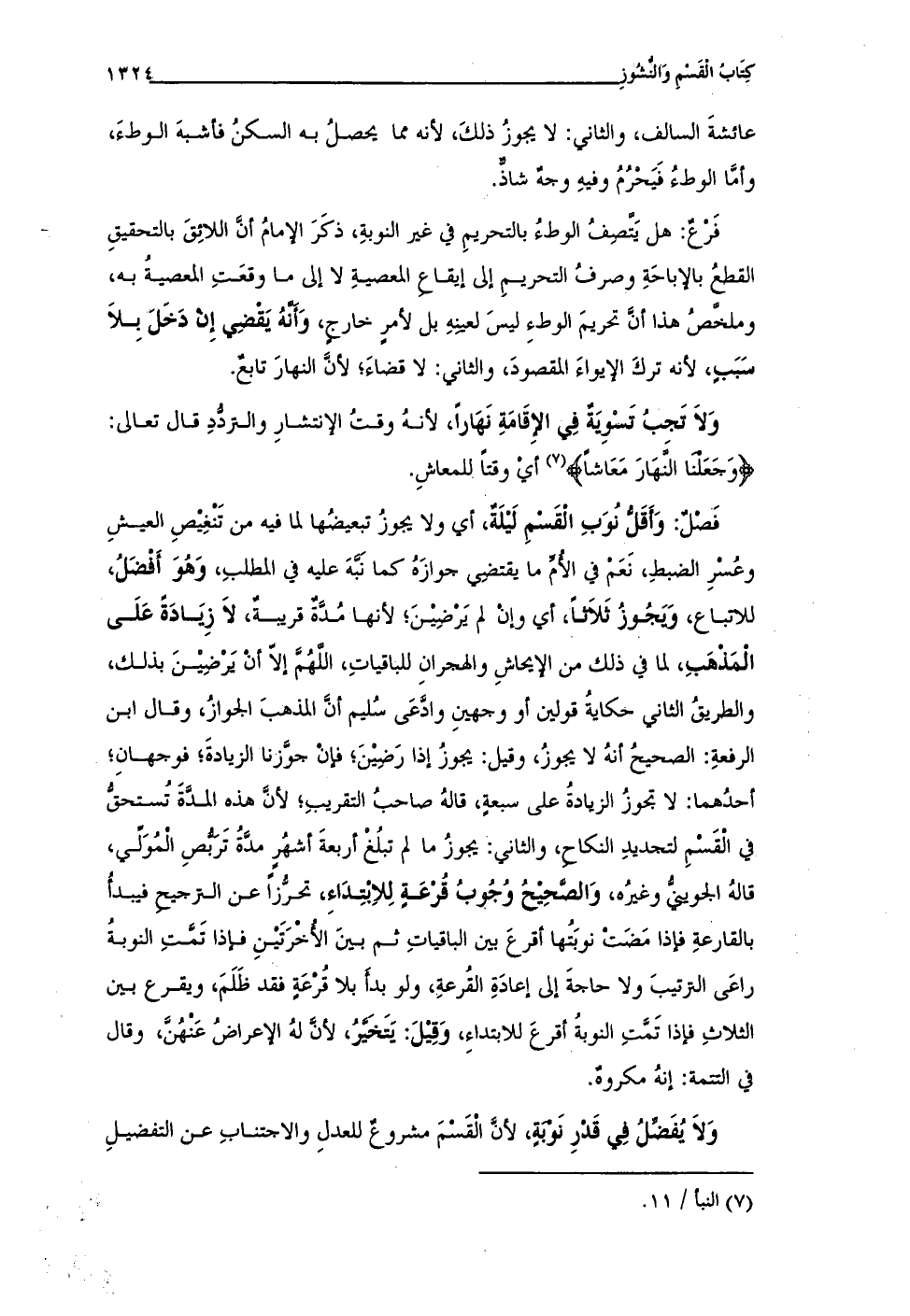 فَصْلٌ: وَأَقَلُّ نُوَبِ الْقَسْمِ لَيْلَةٌ، أي ولا يجوزُ تبعيضُها لما فيه من تَنْغِيْصِ العيشِ وعُسْرِ الضبطِ، نَعَمْ في الأُمِّ ما يقتضِى جوازَهُ كما نَبَّهَ عليه في المطلبِ، وَهُوَ أَفْضَلُ، للاتباع، وَيَجُوزُ ثَلاَثًا، أي وإنْ لم يَرْضِيْنَ؛ لأنها مُّدَّةٌ قريبةٌ، لاَ زِيَادَةً عَلَى الْمَذْهَبِ، لما في ذلك من الإيحاشِ والهجرانِ للباقياتِ، اللَّهُمَّ إلاّ أنْ يَرْضِيْنَ بذلك، والطريقُ الثاني حكايةُ قولين أو وجهينِ وادَّعَى سُليم أنَّ المذهبَ الجوازُ، وقال ابن الرفعةِ: الصحيحُ أنهُ لا يجوزُ، وقيل: يجوزُ إذا رَضِيْنَ، فإنْ جوَّزنا الزيادةَ؛ فوجهانِ؛ أحدُهما: لا تجوزُ الزيادةُ على سبعةٍ، قالهُ صاحبُ التقريبِ؛ لأنَّ هذه المدَّةَ تُستحقُّ في الْقَسْمِ لتحديدِ النكاح، والثانى: يجوزُ ما لم تبلُغْ أربعةَ أشهُرٍ مدَّةُ تَرَبُّصِ الْمُوَلِّي، قالهُ الجوينيُّ وغيرُه، وَالصَّحِيحُ وُجُوبُ قُرْعَةٍ لِلاِبْتِدَاءِ، تحرُّزًا عن الترجيح فيبدأُ بالقارعةِ فإذا مَضَتْ نوبَتُها أقرعَ بين الباقياتِ ثم بينَ الأُخْرَتَيْنِ فإذا تَمَّتِ النوبةُ راعَى الترتيبَ ولا حاجةَ إلى إعادَةِ القُرعةِ، ولو بدأ بلا قُرْعَةٍ فقد ظَلَمَ، ويقرع بين الثلاثِ فإذا تَمَّتِ النوبةُ أقرعَ للابتداءِ، وَقِيْلَ: يتَخَيَّرُ، لأنَّ لهُ الإعراضُ عَنْهُنَّ، وقال في التتمة: إنهُ مكروهٌ.