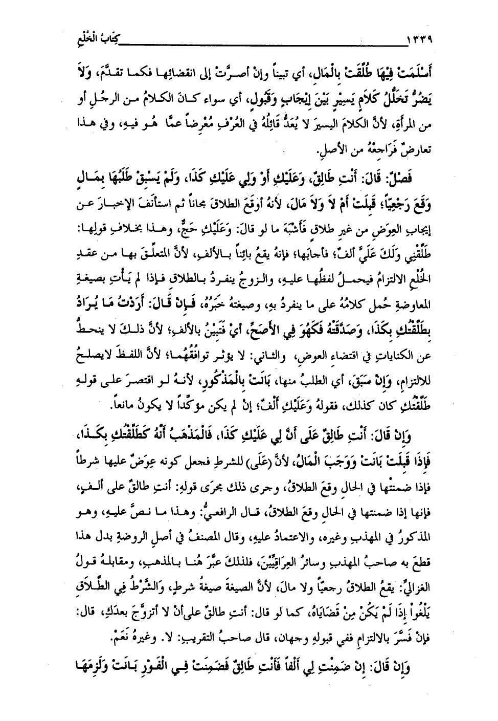 فَصْلٌ: قَالَ: أَنْتِ طَالِقٌ، وَعَلَيْكِ أوْ وَلِي عَلَيْكِ كَذَا، وَلَمْ يَسْبِق طَلَبُهَا بِمَالٍ وَقَعَ رَجْعِيًّا؛ قَبِلَتْ أَمْ لاَ وَلاَ مَالَ، لأنهُ أوقَعَ الطلاقَ مجاناً ثم استأنَفَ الإخبارَ عن إيجابِ العِوَضِ من غيرِ طلاقٍ فَأَشْبَهَ ما لو قالَ: وَعَلَيْكِ حَجٍّ، وهذا بخلافِ قولِها: طَلِّقْنِي وَلَكَ عَلَىَّ ألفٌ؛ فأجابَها؛ فإنَّهُ يقْعُ بائِناً بالألفِ، لأنَّ المتعلِّقَ بها من عقدِ الخُلْع الالتزامُ فيحملُ لفظُها عليهِ، والزوجُ ينفردُ بالطلاقِ فإذا لم يَأْتِ بصيغةِ المعاوضةِ حُمل كلامُهُ على ما ينفردُ بهِ، وصيغتهُ خَبَرُهُ، فَإن قَالَ: أَرَدْتُ مَا يُرَادُ بِطَلَّقْتُكِ بِكَذَا، وَصَدَّقَتْهُ فَكَهُوَ فِي الأصَحِّ، أيْ فَتَبِيَّنُ بالألفِ؛ لأنَّ ذلكَ لا ينحطُّ عن الكناياتِ في اقتضاءِ العوضِ، والثاني: لا يؤثر توافقُهُما؛ لأنَّ اللفظَ لا يصلحُ للالتزامِ، وِإنْ سَبَقَ، أي الطلبُ منها، بَانَتْ بِالْمَذْكُورِ، لأنهُ لو اقتصرَ على قولهِ طَلَّقْتُكِ كان كذلك، فقولهُ وَعَلَيْكِ ألْفٌ؛ إنْ لم يكن مؤكَّداً لا يكونُ مانعاً.