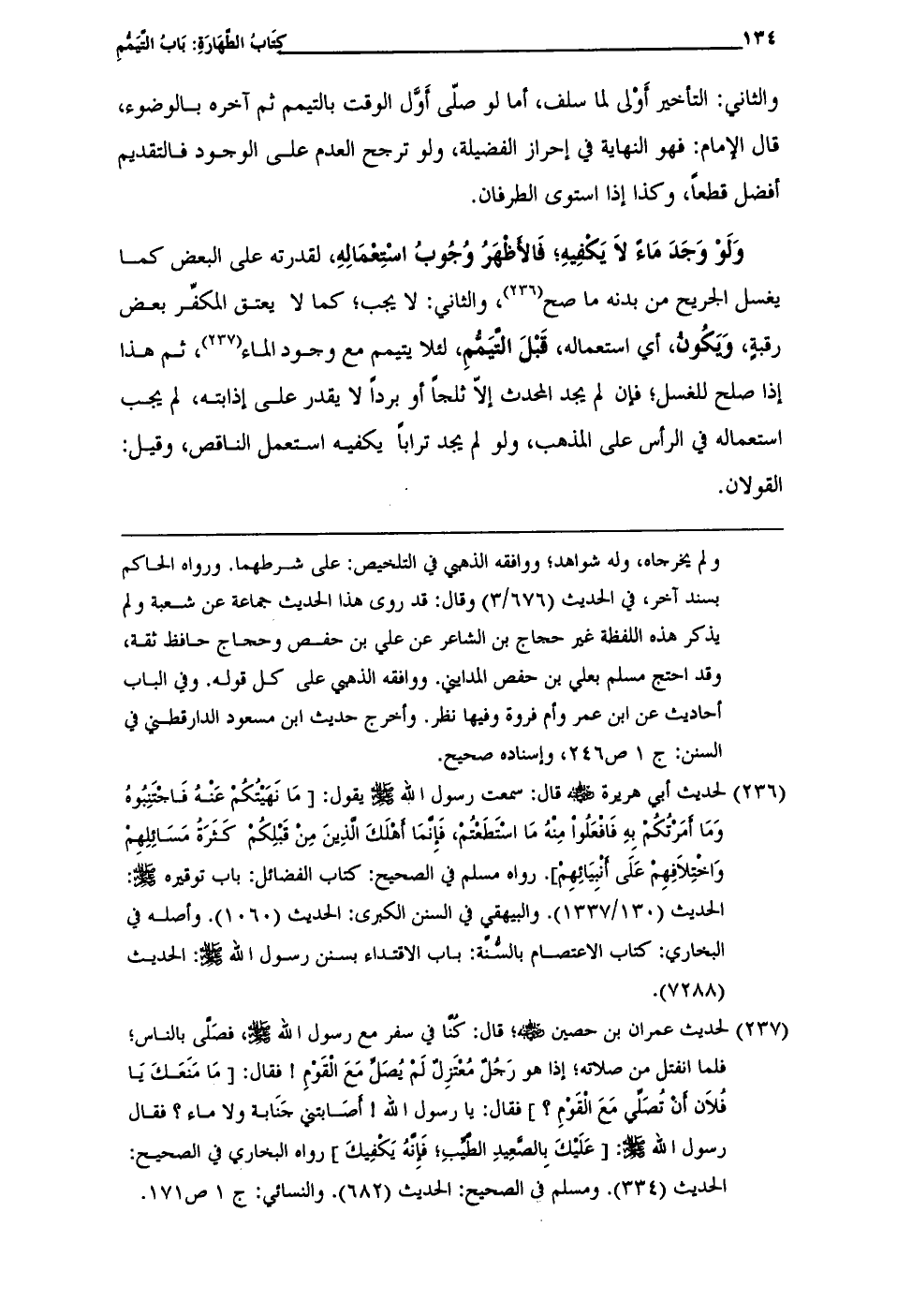 (¬237) لحديث عمران بن حصين - رضي الله عنه -؛ قال: كُنَّا في سفر مع رسول الله - صلى الله عليه وسلم -، فصَلَّى بالناس؛ فلما انفتل من صلاته؛ إذا هو رَجُلٌ مُعْتَزِلٌ لَمْ يُصَلِّ مَعَ الْقَوْمِ! فقال: [مَا مَنَعَكَ يَا فُلَان أَنْ تُصَلِّي مَعَ الْقَوْمِ؟ ] فقال: يا رسول الله! أَصَابتني جَنَابة ولا ماء؟ فقال رسول الله - صلى الله عليه وسلم -: [عَلَيِّكَ بِالصَّعِيدِ الطَّيِّبِ، فَإِنَّهُ يَكْفِيكَ] رواه البخاري في الصحيح: