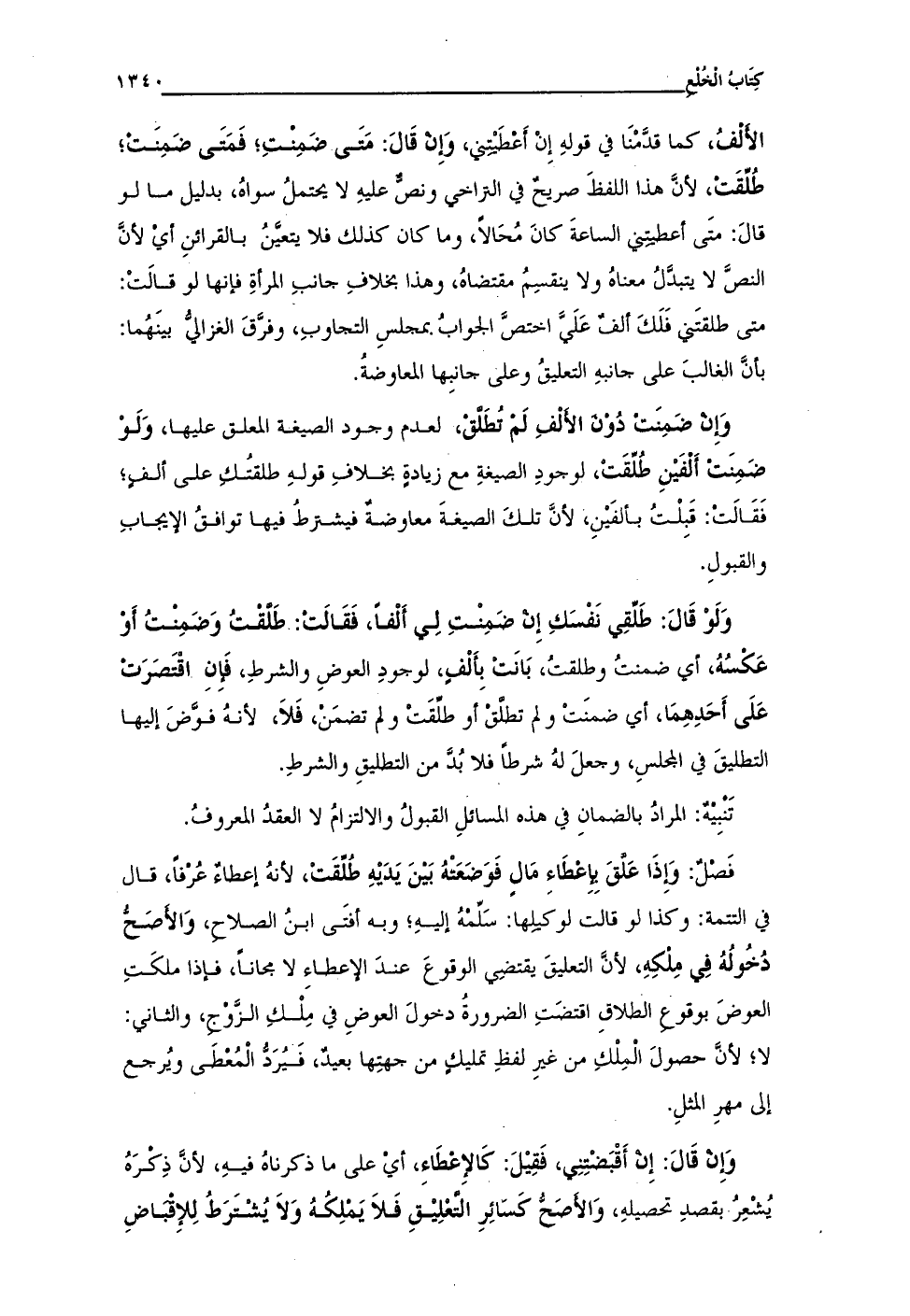 الألْفُ، كما قدَّمْنَا في قولهِ إِنْ أَعْطَيْتِني، وَإِنْ قَالَ: مَتَى ضَمِنْتِ؛ فَمَتَى ضَمِنَتْ؛ طُلِّقَتْ، لأنَّ هذا اللفظَ صريحٌ في التراخى ونصٌّ عليهِ لا يحتملُ سواهُ، بدليل ما لو قالَ: متَى أعطيتِني الساعةَ كانَ مُحَالاً، وما كان كذلك فلا يتعيَّنُ بالقرائنِ أيْ لأنَّ النصَّ لا يتبدَّلُ معناهُ ولا ينقسِمُ مقتضاهُ، وهذا بخلافِ جانبٍ المرأةِ فإنها لو قَالَتْ: متى طلقتَني فَلَكَ ألفٌ عَلَيَّ اختصَّ الجوابُ بمجلسِ التجاوبِ، وفرَّقَ الغزاليُّ بينَهُما: بأنَّ الغالبَ على جانبهِ التعليقُ وعلى جانبِها المعاوضةُ.