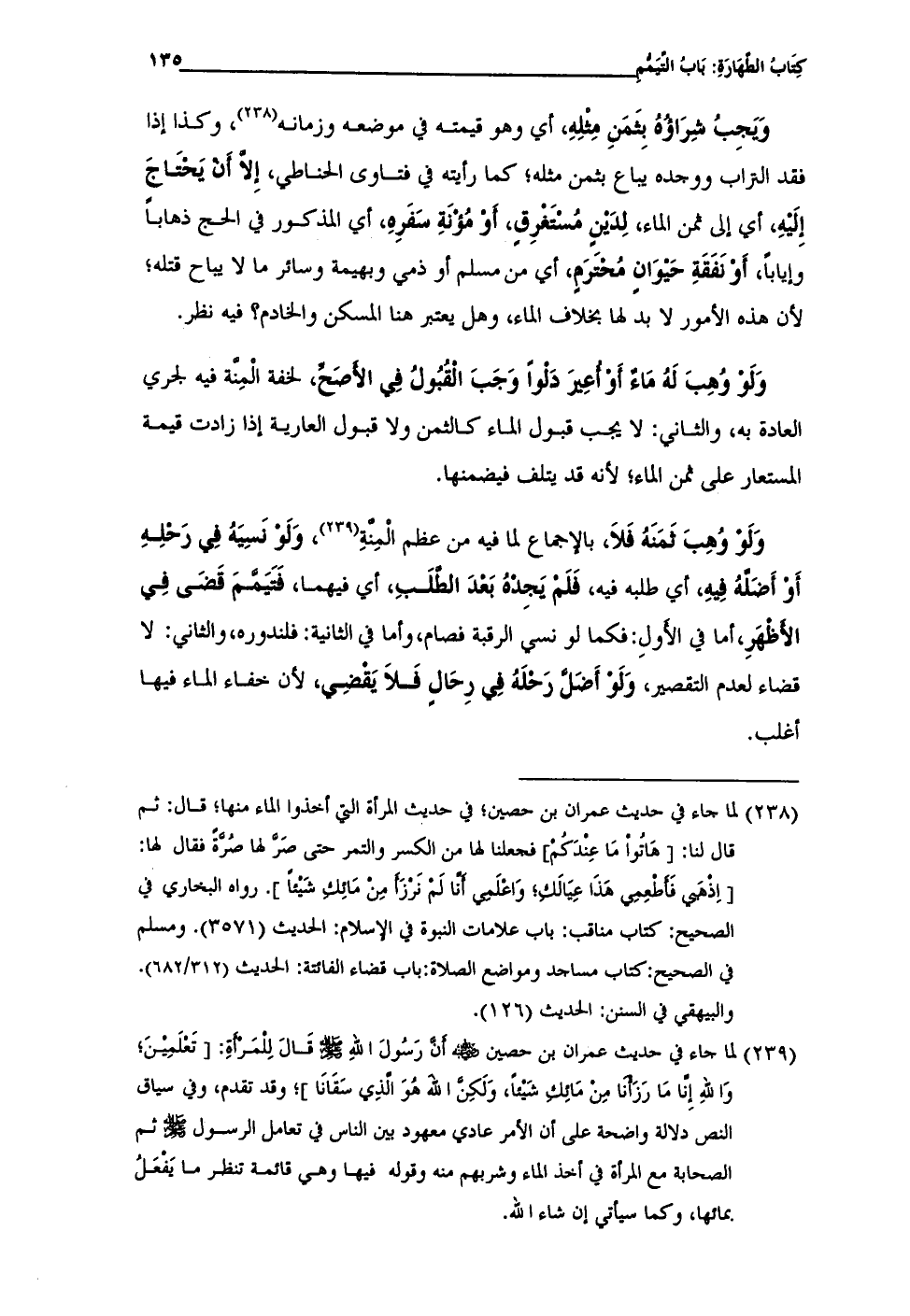 (¬239) لما جاء في حديث عمران بن حصين - رضي الله عنه - أنَّ رَسُولَ اللهِ - صلى الله عليه وسلم - قَالَ لِلْمَرْأَةِ: [تَعْلَمِيْنَ؛ وَاللهِ إِنَّا مَا رَزَأنَا مِنْ مَائِكِ شَيْئًا، وَلَكِنَّ الله هُوَ الَّذِي سَقَانَا]؛ وقد تقدم، وفي سياق النص دلاله واضحة على أن الأمر عادى معهود بين الناس في تعامل الرسول - صلى الله عليه وسلم - ثم الصحابة مع المرأة في أخذ الماء وشربهم منه وقوله فيها وهي قائمة تنظر ما يَفْعَلُ بمائها، وكما سيأتى إن شاء الله.