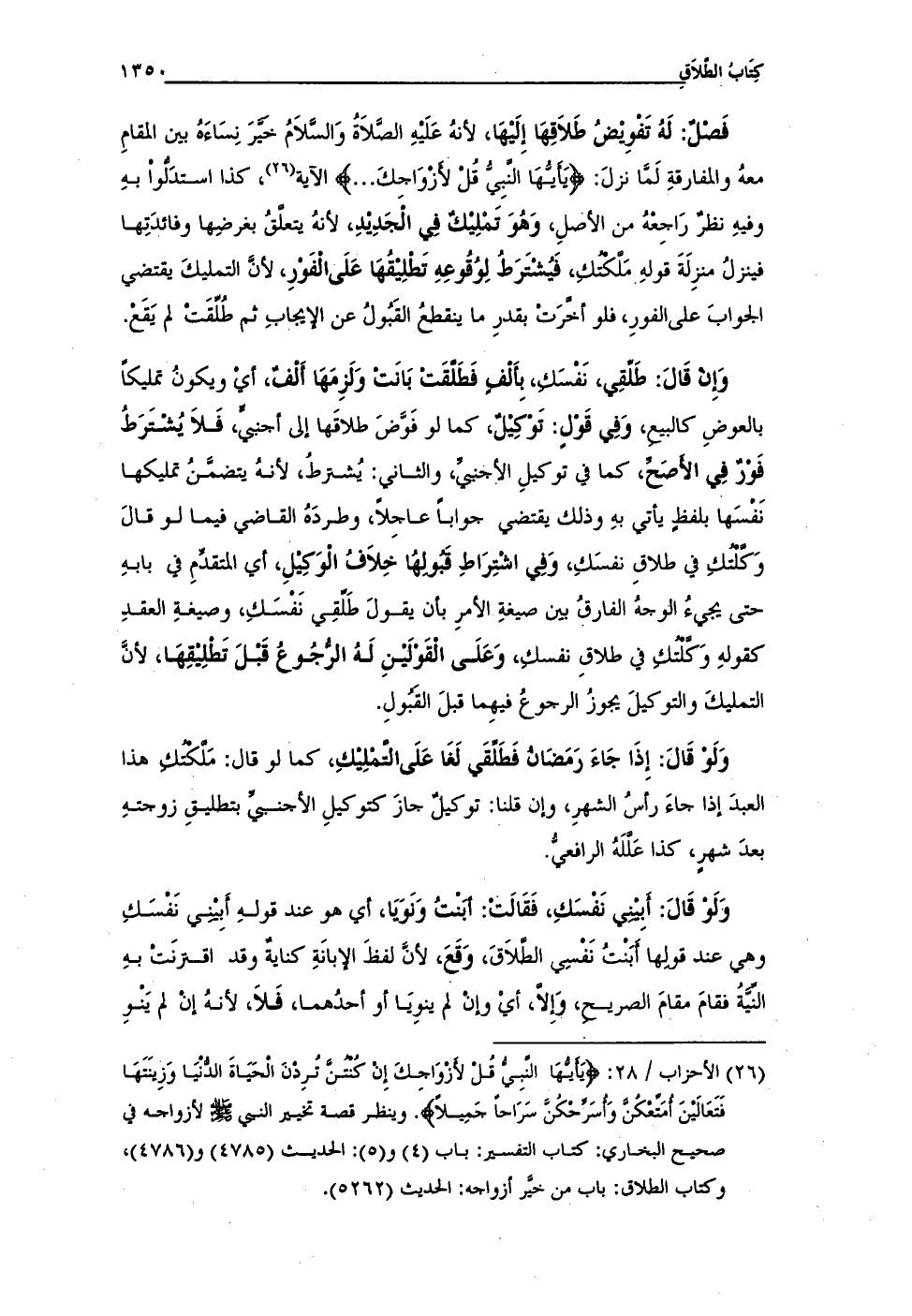 (¬26) الأحزاب / 28: {يَاأَيُّهَا النَّبِيُّ قُلْ لِأَزْوَاجِكَ إِنْ كُنْتُنَّ تُرِدْنَ الْحَيَاةَ الدُّنْيَا وَزِينَتَهَا فَتَعَالَيْنَ أُمَتِّعْكُنَّ وَأُسَرِّحْكُنَّ سَرَاحًا جَمِيلًا}. وينظر قصة تخيير النبي - صلى الله عليه وسلم - لأزواجه في صحيح البخارى: كتاب التفسير: باب (4) و (5): الحديث (4785) و (4786)، وكتاب الطلاق: باب من خيَّر أزواجه: الحديث (5262).