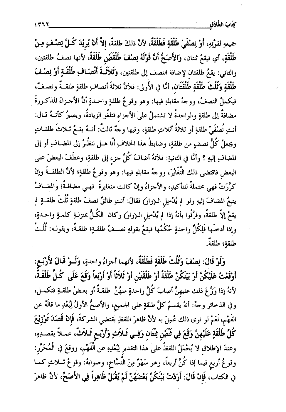 جميعهِ لقوَّتِهِ، أَوْ نِصْفَيْ طَلْقَةٍ فَطَلْقَةٌ، لأنَّ ذلكَ طلقةٌ، إِلَّا أَنْ يُرِيْدَ كُلَّ نِصْفٍ مِنْ طَلْقَةٍ، أي فيقعُ ثنتان، وَالَأصَحُّ أَنَّ قَوْلَهُ نِصْفَ طَلْقَتَيْنِ طَلْقَةُّ، لأنها نصفُ طلقتين، والثاني: يقعُ طلقتان لإضافة النصف إلى طلقتين، وَثَلاَثَةَ أنْصَافِ طَلْقَةٍ أوْ نِصْفَ طَلْقَةٍ وَثُلُثَ طَلْقَةٍ طَلْقَتَانِ، أمَّا في الأُولى: فلأنَّ ثلاثةَ أنصافِ طلقةٍ طلقةٌ ونصفٌ، فيكملُ النصفُ، ووجهُ مقابلهِ فيها: وهو وقوعُ طلقةٍ واحدةٍ أنَّ الأجزاءَ المذكورةَ مضافةُ إلى طلقةٍ والواحدةُ لا تشتملُ على الأجزاءِ فتلغُو الزيادةُ، ويصيرُ كأنهُ قال: أنتِ نُصْفَيْ طلقةٍ أو ثلاثةُ أثلاثِ طلقةٍ، وفيها وجهٌ ثالثُ: أنهُ يقعُ ثلاثَ طلقاتٍ ويجعلُ كُلُّ نصفٍ من طلقةٍ، وضابطُ هذا الخلافِ أنَّا هل ننظُرُ إلى المضافِ أو إلى المضافِ إليهِ؟ وأمَّا في الثانيةِ: فلأنهُ أضافَ كُلَّ جزءٍ إلى طلقةِ، وعطَفَ البعضَ على البعضِ فاقتضى ذلك التَّغَايُرَ، ووجهُ مقابلهِ فيها: وهو وقوعُ طلقةٍ؛ لأنَّ الطلقةَ وإنْ كرَّرَتْ فهي محتملةٌ للتأكيدِ، والأجزاءُ وإنْ كانت متغايرةً فهي مضافةُ؛ والمضافُ يتبعُ المضافَ إليهِ ولو لم يُدْخِلِ الـ (واوَ) فقالَ: أنتِ طالقٌ نصفَ طلقةٍ ثُلُثَ طلقةٍ لم يقعْ إلاّ طلقةً، وفرَّقُوا بأنهُ إذا لم يُدْخِلِ الـ (واوَ) وكان الكُلُّ بمنزلةِ كلمةٍ واحدةٍ، وإذا أدخلَها فَلِكُلِّ واحدةٍ حُكْمُها فيقعُ بقولهِ نصفُ طلقةٍ؛ طلقةٌ، وبقوله: ثُلُثُ طلقةٍ؛ طلقةٌ.