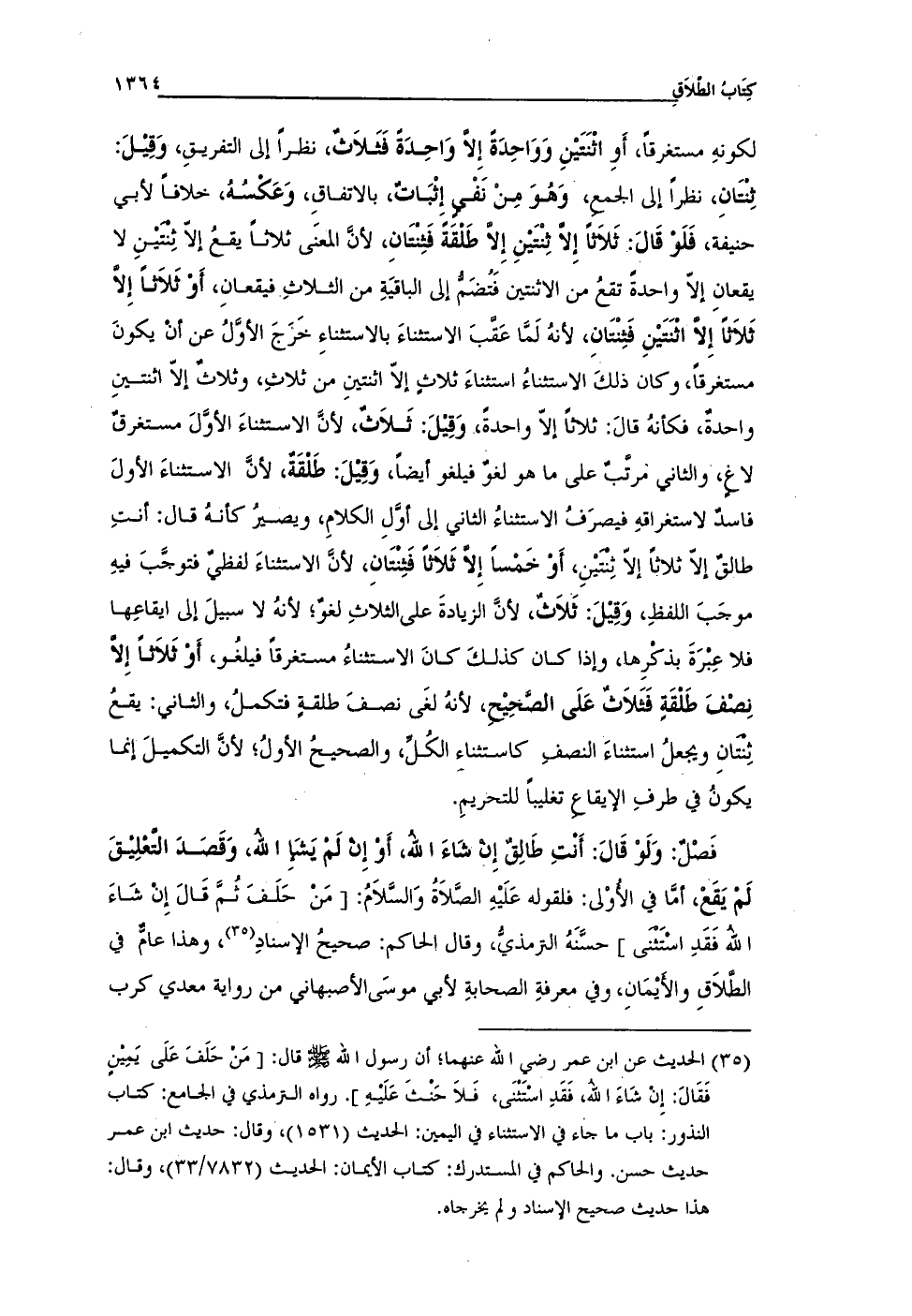 فَصْلٌ: وَلَوْ قَالَ: أَنْتِ طَالِقٌ إِنْ شَاءَ اللهُ، أَوْ إِنْ لَمْ يَشَإِ اللهُ، وَقَصَدَ {التَّعْلِيقَ} لَمْ يَقَعْ، أمَّا في الأُوْلى: فلقوله عَلَيْهِ الصَّلاَةُ وَالسَّلاَمُ: {مَنْ حَلَفَ ثُمَّ قَالَ إِنْ شَاءَ الله فَقَدِ اسْتَثْنَى} حسَّنَهُ الترمذيُّ، وقال الحاكم: صحيحُ الإسنادِ (¬35)، وهذا عامٌّ في الطَّلاَقِ والأَيْمَانِ، وفي معرفةِ الصحابةِ لأبي موسَى الأصبهاني من رواية معدي كرب