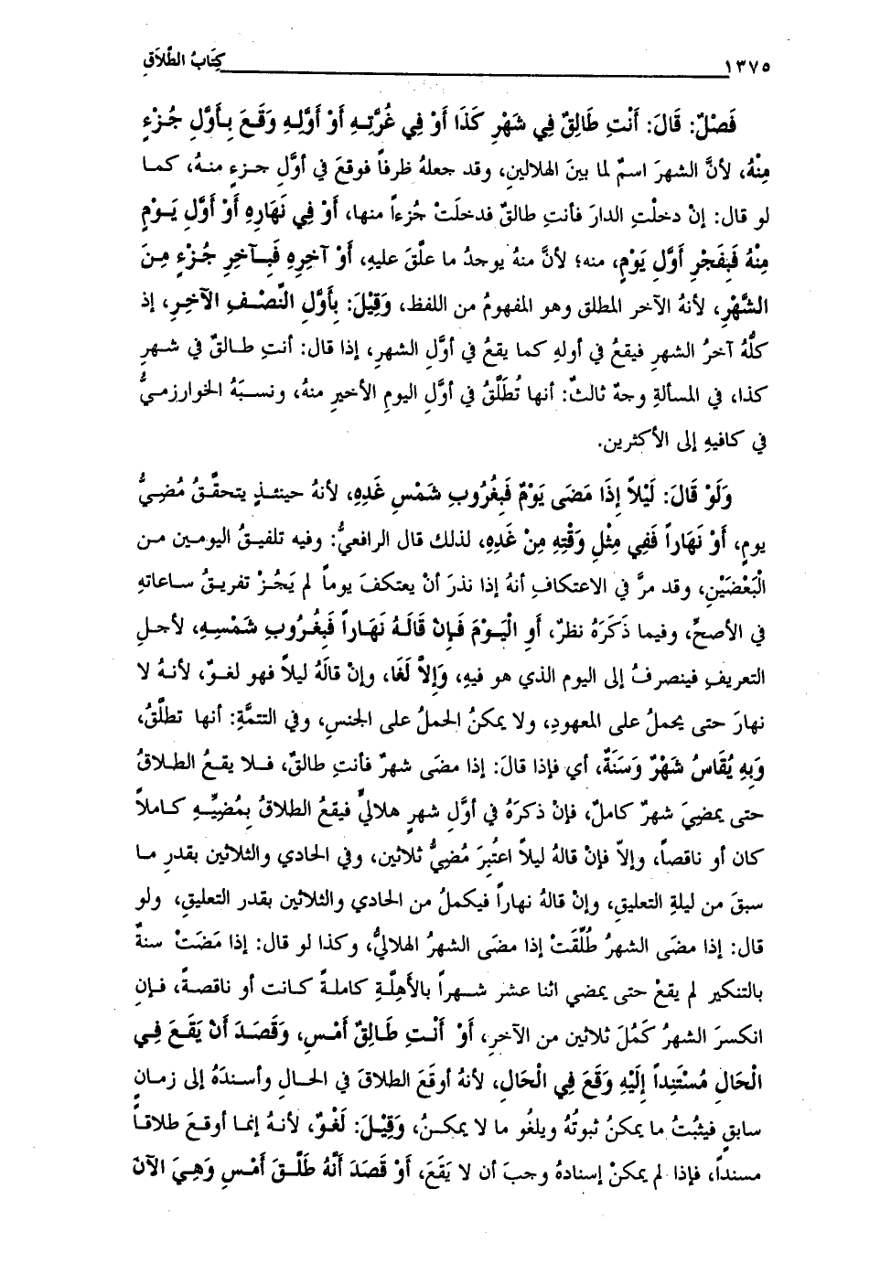فَصْلٌ: قَالَ: أَنْتِ طَالِقٌ فِي شَهْرِ كَذَا أَوْ فِي غُرَّتِهِ أَوْ أوَّلِهِ وَقَعَ بِأوَّلِ جُزْءٍ مِنْهُ، لأنَّ الشهرَ اسمٌ لما بينَ الهلالينِ، وقد جعلهُ ظرفاً فوقعَ في أوَّلِ جزءٍ منهُ، كما لو قال: إنْ دخلْتِ الدارَ فأنتِ طالقٌ فدخلَتْ جُزءاً منها، أَوْ فِي نَهَارِهِ أَوْ أَوَّلِ يَوْمٍ مِنْهُ فَبفَجْرِ أَوَّلِ يَوْمٍ، منه؛ لأنَّ منهُ يوجدُ ما علَّقَ عليهِ، أَوْ آخِرِهِ فَبِآخِرِ جُزْءٍ مِنَ الشَّهْرِ، لأنهُ الآخر المطلق وهو المفهومُ من اللفظ، وَقِيْلَ: بِأَوَّلِ النِّصْفِ الآخِرِ، إذ كلُّهُ آخرُ الشهرِ فيقعُ في أولهِ كما يقعُ في أوَّلِ الشهرِ، إذا قال: أنتِ طالقٌ في شهرِ كذا، في المسألةِ وجهٌ ثالثٌ: أنها تُطَلَّقُ في أوَّلِ اليومِ الأخيرِ منهُ، ونسبَهُ الخوارزميُّ في كافيهِ إلى الأكثرين.