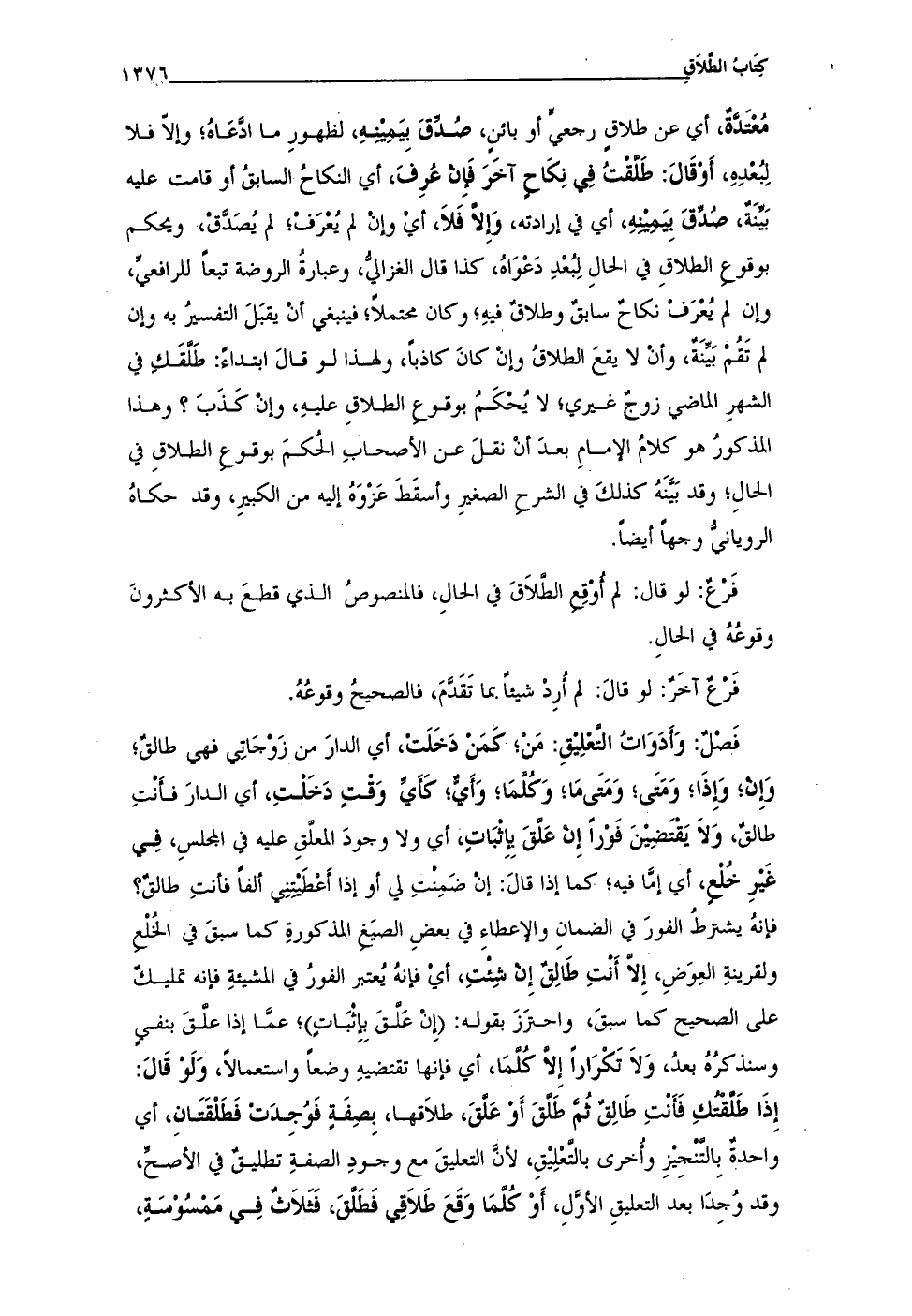 فَصْلٌ: وَأَدَوَاتُ التَّعْلِيْقِ: مَنْ؛ كَمَنْ دَخَلَتْ، أي الدارَ من زَوْجَاتِي فهى طالقٌ؛ وَإِنْ؛ وِإذَا؛ وَمَتَى؛ وَمَتَى مَا؛ وَكُلَّمَا؛ وَأَيٌّ؛ كَأَيِّ وَقْتٍ دَخَلْتِ، أي الدارَ فأَنْتِ طالقٌ، وَلاَ يَقْتَضِيْنَ فَوْراً إِنْ عَلَّقَ بإِثْبَاتٍ، أي ولا وجودَ المعلَّقِ عليه في المجلسِ، فِي غَيْرِ خُلْعٍ، أي إمَّا فيه؛ كما إذا قالَ: إنْ ضَمِنْتِ لي أو إذا أَعْطَيْتِنِى ألفاً فأنتِ طالقٌ؟ فإنهُ يشترطُ الفورَ في الضمانِ والإعطاءِ في بعضِ الصيَغِ المذكورةِ كما سبقَ في الخُلْعِ ولقرينةِ العِوَضِ، إِلاَّ أَنْتِ طَالِقٌ إِنْ شِئْتِ، أيْ فإنهُ يُعتبر الفورُ في المشيئةِ فإنه تمليكٌ على الصحيح كما سبقَ، واحترَزَ بقوله: (إِنْ عَلَّقَ بِإِثْبَاتٍ)؛ عمَّا إذا علَّقَ بنفيٍ وسنذكرُهُ بعدُ، وَلاَ تَكْرَاراً إِلاَّ كُلَّمَا، أي فإنها تقتضيهِ وضعاً واستعمالاً، وَلَوْ قَالَ: إِذَا طَلَّقْتُكِ فَأَنْتِ طَالِقٌ ثُمَّ طَلَّقَ أَوْ عَلَّقَ، طلاَقها، بِصِفَةٍ فَوُجِدَتْ فَطَلْقَتَانِ، أي واحدةٌ بِالتَّنْجِيْزِ وأُخرى بالتَّعْلِيْقِ، لأنَّ التعليقَ مع وجودِ الصفةِ تطليقٌ فِي الأصحِّ، وقد وُجِدَا بعد التعليقِ الأوَّلِ، أَوْ كُلَّمَا وَقَعَ طَلاَقِي فَطَلَّقَ، فَثَلاَثٌ فِي مَمْسُوْسَةٍ،