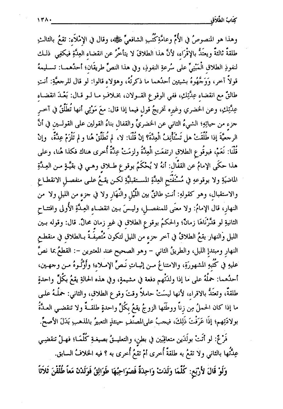 وهذا هو المنصوصُ في الأُمِّ وعامَّةِ كُتُبِ الشافعيِّ - رضي الله عنه -، وقال في الإِمْلاَءِ: تقعُ بالثالثِ طلقةٌ ثالثةٌ ويعتَدُّ بالإقْرَاءِ، لأنَّ هذا الطلاقَ لا يتأخَّرُ عن انقضاءِ العِدَّةِ فيكفِى ذلك لنفوذِ الطلاقِ الْمَبْنِيِّ على سُرعةِ النفوذِ، وفي هذا النصِّ طريقَانِ؛ أحدُهما: تسليمهُ قولاً آخر، وَوَجَّهُوهُ بشيئين أحدُهما ما ذكرتُهُ، وهؤلاءِ قالوا: لو قال للرجعيَّةِ: أنتِ طالقٌ مع انقضاءِ عِدَّتِكِ، ففي الوقوعِ القولان، بخلافِ ما لو قال: بَعْدَ انقضاءِ عِدَّتِكِ، وعن الخضري وغيرِه تخريجُ قولٍ فيما إذا قال: معَ مَوْتِي أنها تُطَلَّقُ في آخرِ جزء من حياتِهِ؛ الشيءُ الثاني عن الخضريِّ والقفالِ بناءُ القولين على القولين في أنَّ الرجعيَّةَ إذا طُلِّقَتْ هل تَسْتَأْنِفُ الْعِدَّةَ؟ إنْ قُلْنَا: لا، لم تُطَلَّق هُنا ولم تَلْزَمْ عِدَّةٌ، وإنْ قُلْنَا: نَعَمْ، فبوقُوعِ الطلاقِ ارتفعَتِ الْعِدَّةُ ولزمَتْ عِدَّةٌ أُخرى هناك فكذا هُنا، وعلى هذا حكَى الإمامُ عن القفَّالِ: أنهُ لا يُحْكَمُ بوقوعِ طلاقٍ وهى في بقيَّةٍ من العِدَّةِ الماضيَةِ ولا بوقوعهِ في مُسْتَفْتَحِ العِدَّة المستقبليَّةِ لكن يقعُ على منفصلِ الانقطاعِ والاستقبالِ، وهو كقولهِ: أنتِ طالقٌ بين اللَّيْلِ والنَّهَارِ ولا في جزءٍ من الليلِ ولا من النهارِ، قال الإمامُ: ولا معنَى للمنفصلِ، وليسَ بين انقضاءِ العِدَّةِ الأُولى وافتتاحِ الثانيةِ لو قدَّرْنَاهَا زمانٌ؛ والحكمُ بوقوعِ الطلاقِ في غيرِ زمان محالٌ. قال: وقوله بين الليل والنهار يقعُ الطلاقُ في آخر جزءٍ من الليل لتكون مُتَّصِفَةً بالطلاقِ في منقطعِ النهارِ ومبتدإِ الليل، والطريقُ الثاني -وهو الصحيح عند المعتبرين-: القطعُ بما نصَّ عليهِ في كُتُبِهِ المشهورَةِ، والامتناعُ من إثباتِ نَصِّ الإملاءِ؛ وأوَّلُوهُ من وجهين، أحدُهما: حملُهُ على ما إذا ولدَتْهم دفعة في مشيمةٍ، وفي هذه الحالةِ يقعُ بكُلِّ واحدةٍ طلقةٌ، وتعتَدُّ بالاقراءِ، لأنها ليسَتْ حاملاً وقتَ وقوع الطلاقِ، والثاني: حملُهُ على ما إذا كان الحملُ مِن زِناً ووطَئَها الزوجُ يقعُ بِكُلِّ واحدةٍ طلقةٌ ولا تنقضي العدَّةُ بولادَتِهم؛ إذَا عَرَفْتَ ذَلِكَ، فيجبُ على المصنفِ حينئذٍ التعبيرُ بالمذهبِ بَدَلَ الأصحِّ.