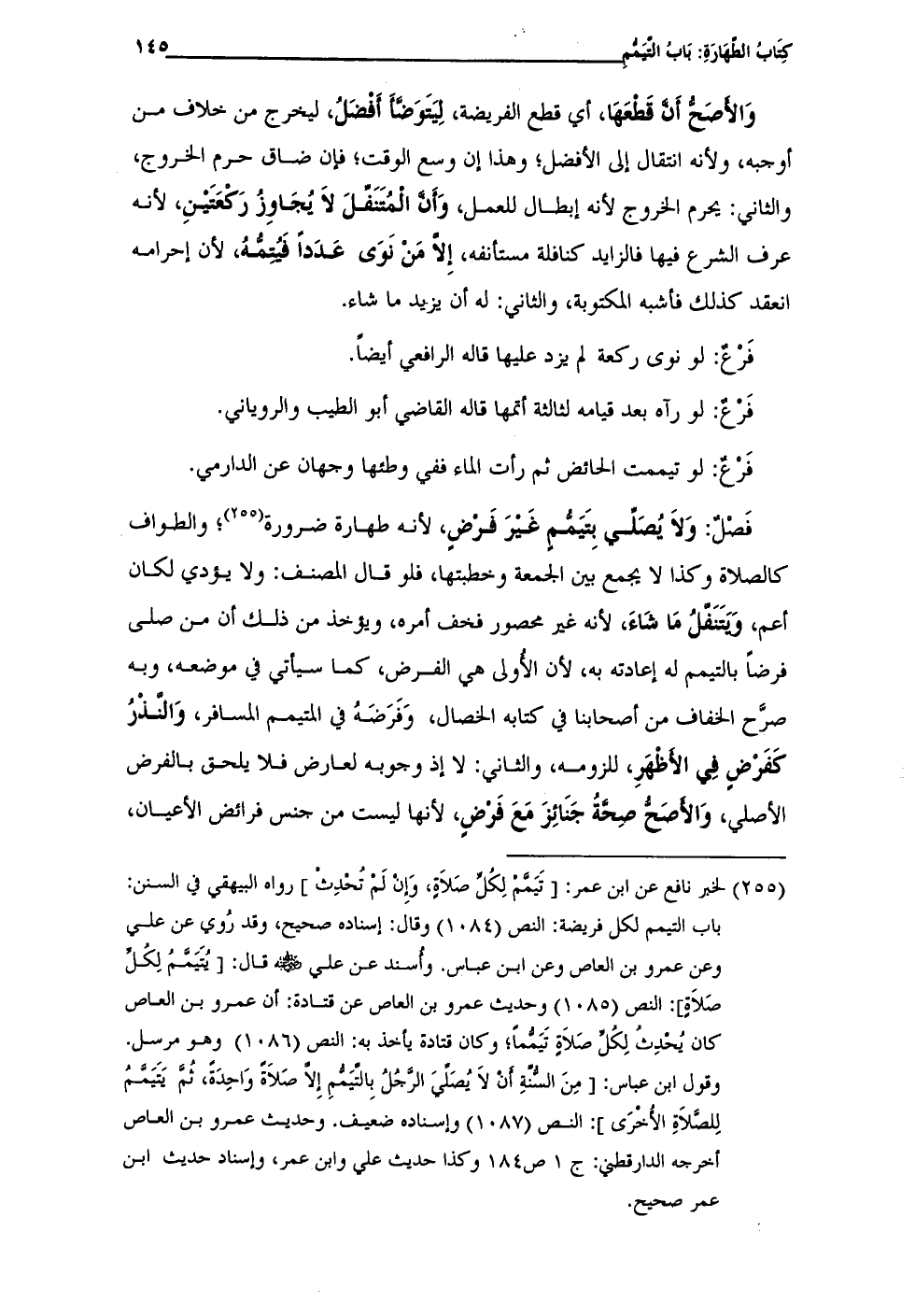 (¬255) لخبر نافع عن ابن عمر: [تَيَمَّمْ لِكُلِّ صَلاَةٍ، وَإِنْ لَمْ تُحْدِثْ، رواه البيهقي في السنن: باب التيمم لكل فريضة: النص (1084) وقال: إسناده صحيح، وقد رُوي عن علي وعن عمرو بن العاص وعن ابن عباس. وأُسند عن علي - رضي الله عنه - قال: [يتَيَمَّمُ لِكُلِّ صَلاَةٍ]: النص (1085) وحديث عمرو بن العاص عن قتادة: أن عمرو بن العاص كان يُحْدِثُ لِكُلِّ صَلاَةٍ تَيَمُّماً؛ وكان قتادة يأخذ به: النص (1086) وهو مرسل.