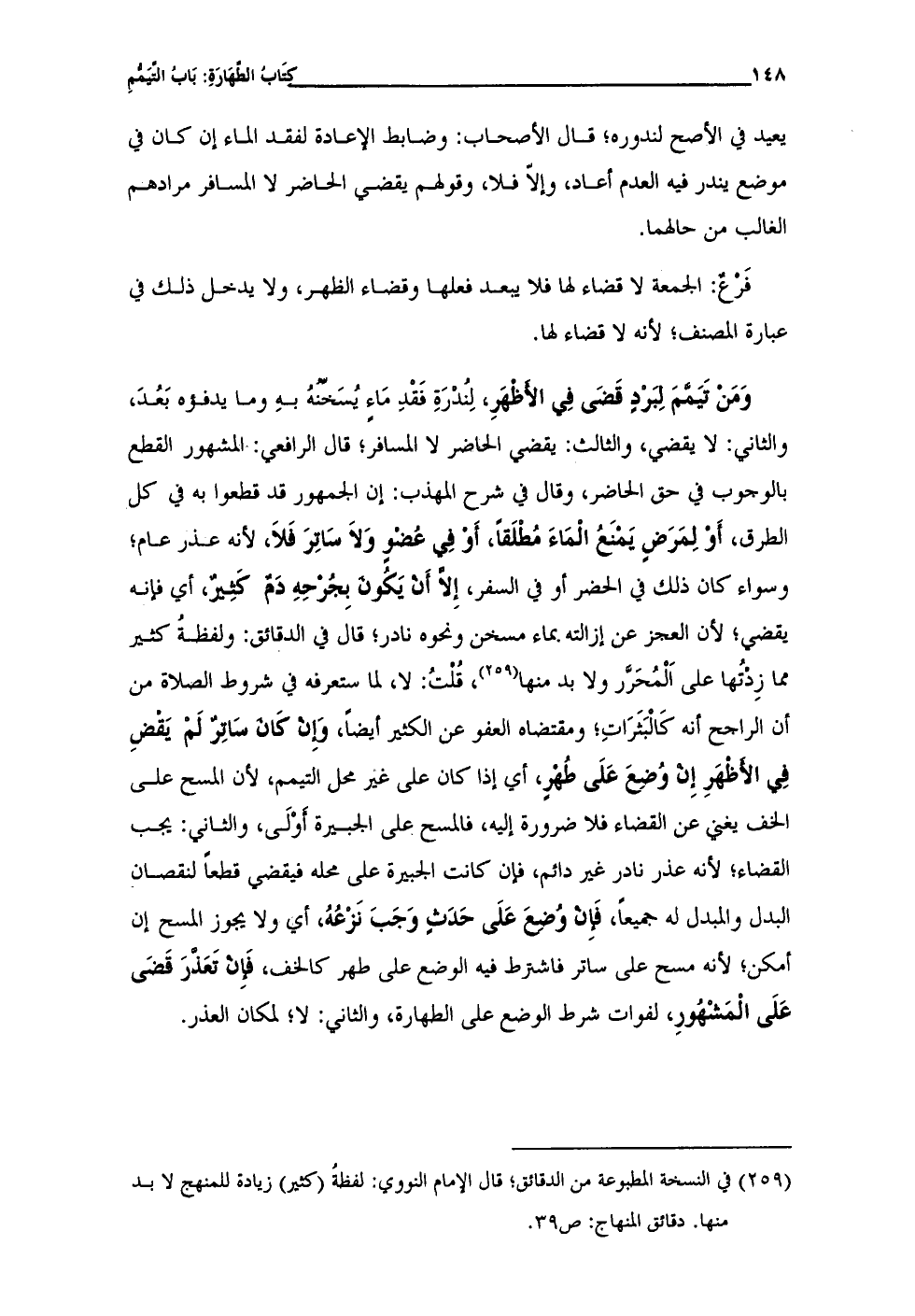 وَمَنْ تَيَمَّمَ لِبَرْدٍ قَضَى فِي الأَظْهَرِ، لِنُدْرَةِ فَقْدِ مَاءٍ يُسَخّنُهُ بهِ وما يدفؤه بَعُدَ، والثاني: لا يقضي، والثالث: يقضي الحاضر لا المسافر؛ قال الرافعي: المشهور القطع بالوجوب في حق الحاضر، وقال في شرح المهذب: إن الجمهور قد قطعوا به في كل الطرق، أَوْ لِمَرَضٍ يَمْنَعُ الْمَاءَ مُطْلَقاً، أَوْ فِي عُضْوٍ وَلاَ سَاتِرَ فَلاَ، لأنه عذر عام؛ وسواء كان ذلك في الحضر أو في السفر، إِلاَّ أَنْ يَكُونَ بِجُرْحِهِ دَمٌ كَثِيرٌ، أي فإنه يقضى؛ لأن العجز عن إزالته بماء مسخن ونحوه نادر؛ قال في الدقائق: ولفظةُ كثير مما زِدْتُها على اَلْمُحَرَّر ولا بد منها (¬259)، قُلْتُ: لا، لما ستعرفه في شروط الصلاة من أن الراجح أنه كَالْبَثَرَاتِ؛ ومقتضاه العفو عن الكثير أيضاً، وَإِنْ كَانَ سَاتِرٌ لَمْ يَقْضِ فِي الأَظْهَرِ إِنْ وُضِعَ عَلَى طُهْرٍ، أي إذا كان على غير محل التيمم، لأن المسح على الخف يغنى عن القضاء فلا ضرورة إليه، فالمسح على الجبيرة أَوْلَى، والثاني: يجب القضاء؛ لأنه عذر نادر غير دائم، فإن كانت الجبيرة على محله فيقضى قطعاً لنقصان البدل والمبدل له جميعاً، فَإِنْ وُضِعَ عَلَى حَدَثٍ وَجَبَ نَزْعُهُ، أي ولا يجوز المسح إن أمكن؛ لأنه مسح على ساتر فاشترط فيه الوضع على طهر كالخف، فَإِنْ تَعَذَّرَ قَضَى عَلَى الْمَشْهُورِ، لفوات شرط الوضع على الطهارة، والثاني: لا؛ لمكان العذر.