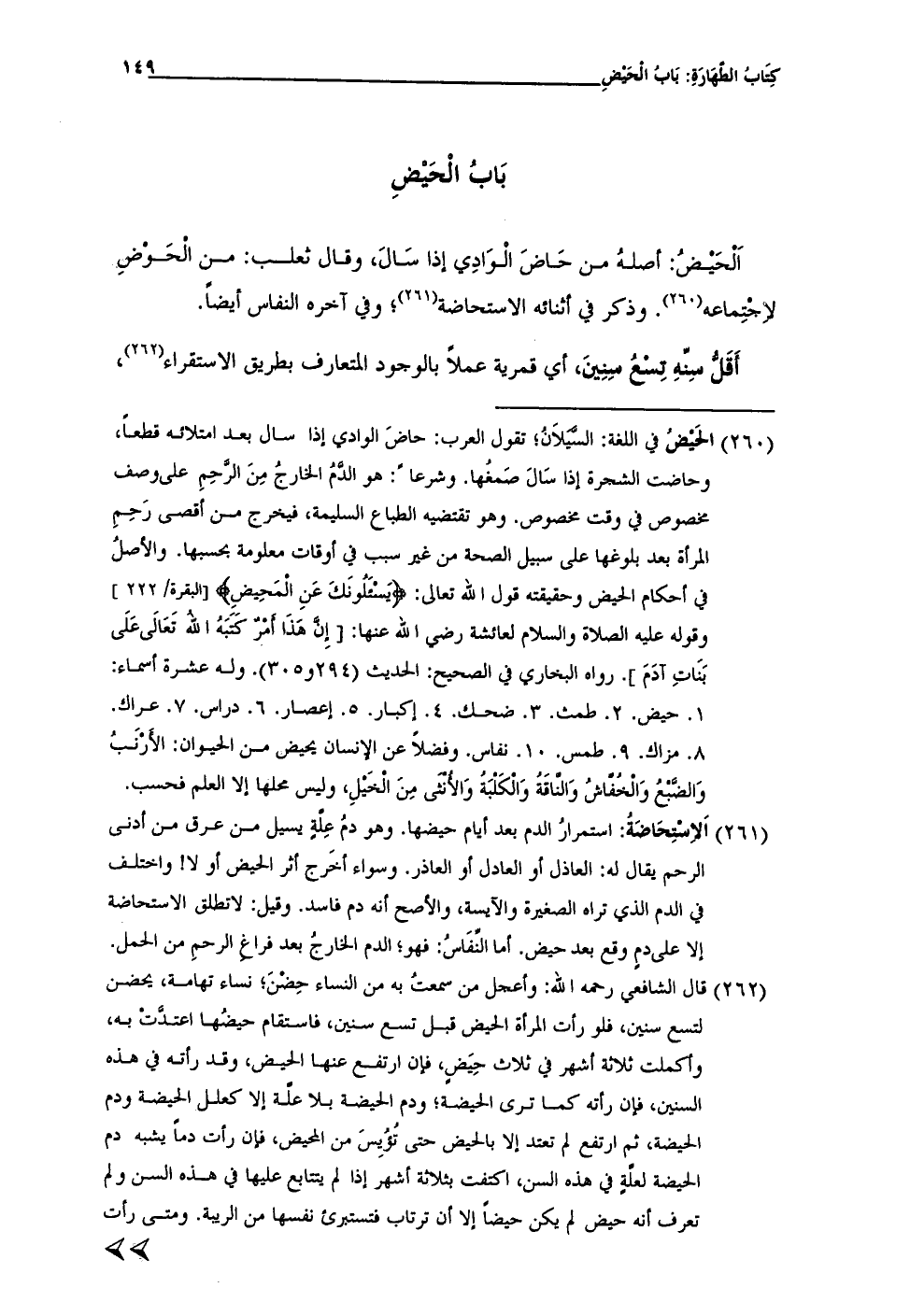 (¬260) الحَيْضُ في اللغة: السَّيَلاَنُ؛ تقول العرب: حاضَ الوادي إذا سال بعد امتلائه قطعاً، وحاضت الشجرة إذا سَالَ صَمغُها. وشرعاً: هو الدَّمُ الخارجُ مِنَ الرَّحِمِ على وصف مخصوص في وقت مخصوص. وهو تقتضيه الطباع السليمة، فيخرج من أقصى رَحِمِ المرأة بعد بلوغها على سبيل الصحه من غير سبب في أوقات معلومة بحسبها. والأصلُ في أحكام الحيض وحقيقته قول الله تعالى: {وَيَسْأَلُونَكَ عَنِ الْمَحِيضِ} [البقرة: 222] وقوله عليه الصلاة والسلام لعائشة رضى الله عنها: [إِنَّ هَذَا أَمْرٌ كَتَبَهُ اللهُ تَعَالَى عَلَى بَنَاتِ أدَمَ]. رواه البخاري في الصحيح: الحديث (294 و 305). وله عشرة أسماء: 1. حيض. 2. طمث. 3. ضحك. 4. إكبار. 5. إعصار. 6. دراس. 7. عراك.