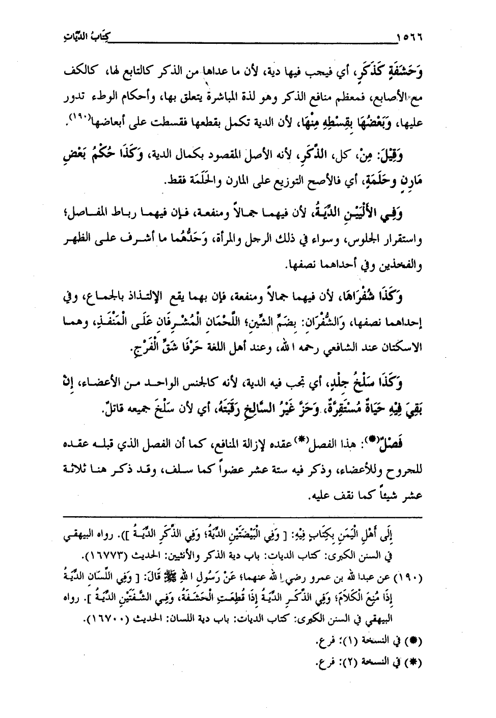 (¬190) عن عبد الله بن عمرو -رضي الله عنهما-، عَنْ رَسُولِ اللهِ - صلى الله عليه وسلم - قَالَ: [وَفِي اللِّسَانِ الدِّيَةُ إذَا مُنِعَ الْكَلَامَ؛ وَفِي الذَّكَرِ الدِّيَةُ إِذَا قُطِعَتِ الحَشَفَةُ، وَفِي الشَّفَتَيْنِ الدِّيَةُ]. رواه البيهقي في السنن الكبرى: كتاب الديات: باب دية اللسان: الحديث (16700).