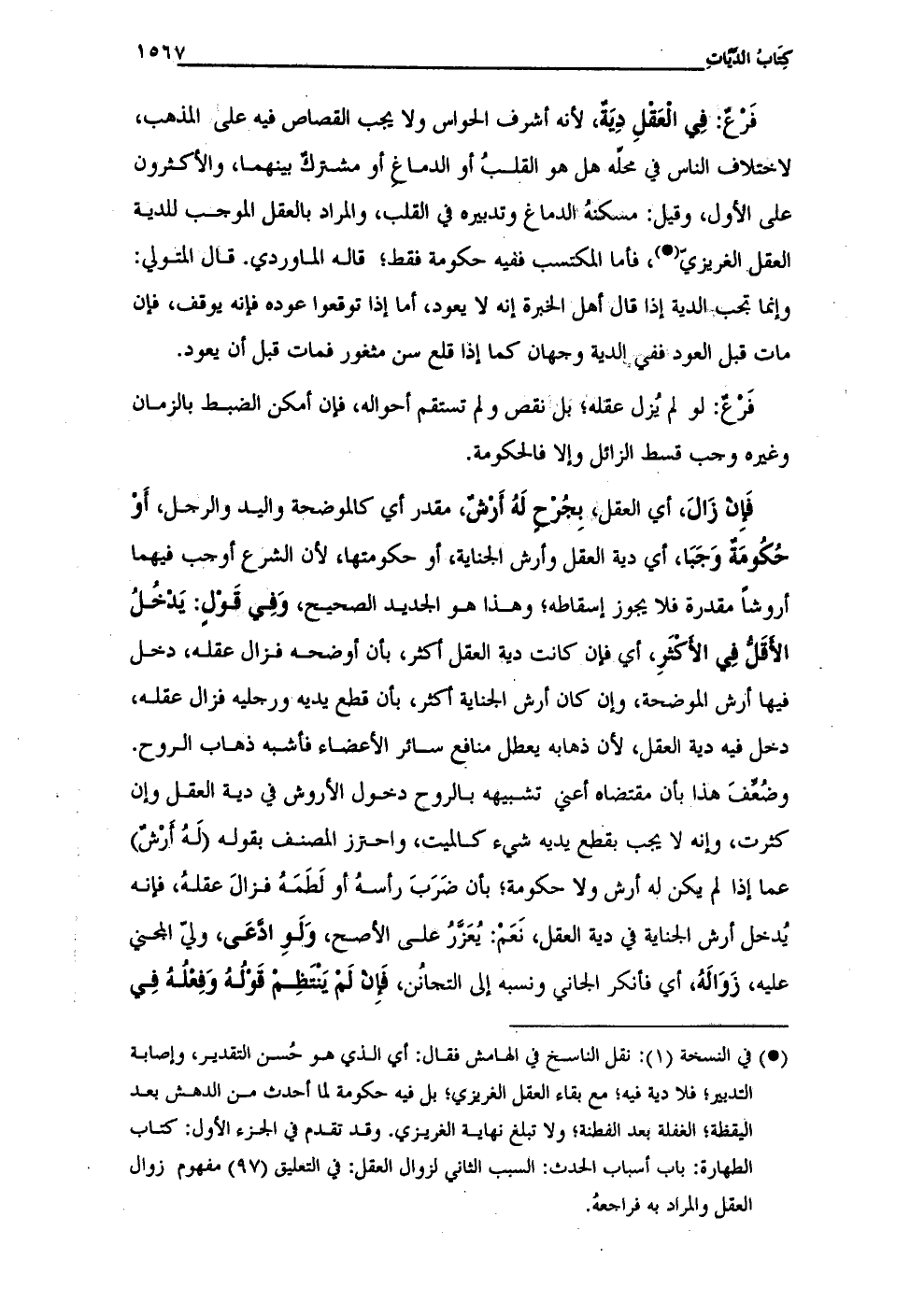 (•) في النسخة (1): نقل الناسخ في الهامش فقال: أي الذي هو حُسن التقدير، وإصابة التدبير؛ فلا دية فيه؛ مع بقاء العقل الغريزي؛ بل فيه حكومة لما أحدث من الدهش بعد اليقظة؛ الغفلة بعد الفطنة؛ ولا تبلغ نهاية الغريزي. وقد تقدم في الجزء الأول: كتاب الطهارة: باب أسباب الحدث: السبب الثاني لزوال العقل: في التعليق (97) مفهوم زوال العقل والمراد به فراجعهُ.