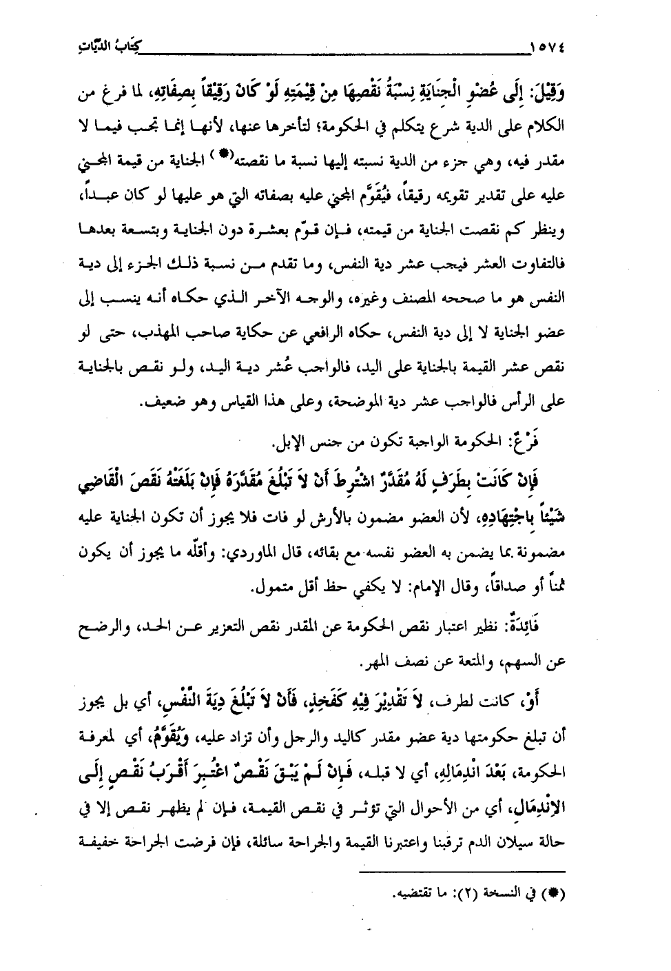 وَقِيلَ: إِلَى عُضْوِ الجِنَايَةِ نِسْبَةُ نَقْصِهَا مِنْ قِيمَتِهِ لَوْ كَان رَقِيْقًا بِصِفَاتِهِ، لما فرغ من الكلام على الدية شرع يتكلم في الحكومة؛ لتأخرها عنها، لأنها إنما تجب فيما لا مقدر فيه، وهي جزء من الدية نسبته إليها نسبة ما نقصته (•) الجناية من قيمة المجني عليه على تقدير تقويمه رقيقًا، فيُقَوَّم المجني عليه بصفاته التي هو عليها لو كان عبدًا، وينظر كم نقصت الجناية من قيمته، فإن قوم بعشرة دون الجناية وبتسعة بعدها فالتفاوت العشر فيجب عشر دية النفس، وما تقدم من نسبة ذلك الجزء إلى دية النفس هو ما صححه المصنف وغيره، والوجه الآخر الذي حكاه أنه ينسب إلى عضو الجناية لا إلى دية النفس، حكاه الرافعي عن حكاية صاحب المهذب، حتى لو نقص عشر القيمة بالجناية على اليد، فالواجب عُشر دية اليد، ولو نقص بالجناية على الرأس فالواجب عشر دية الموضحة، وعلى هذا القياس وهو ضعيف.