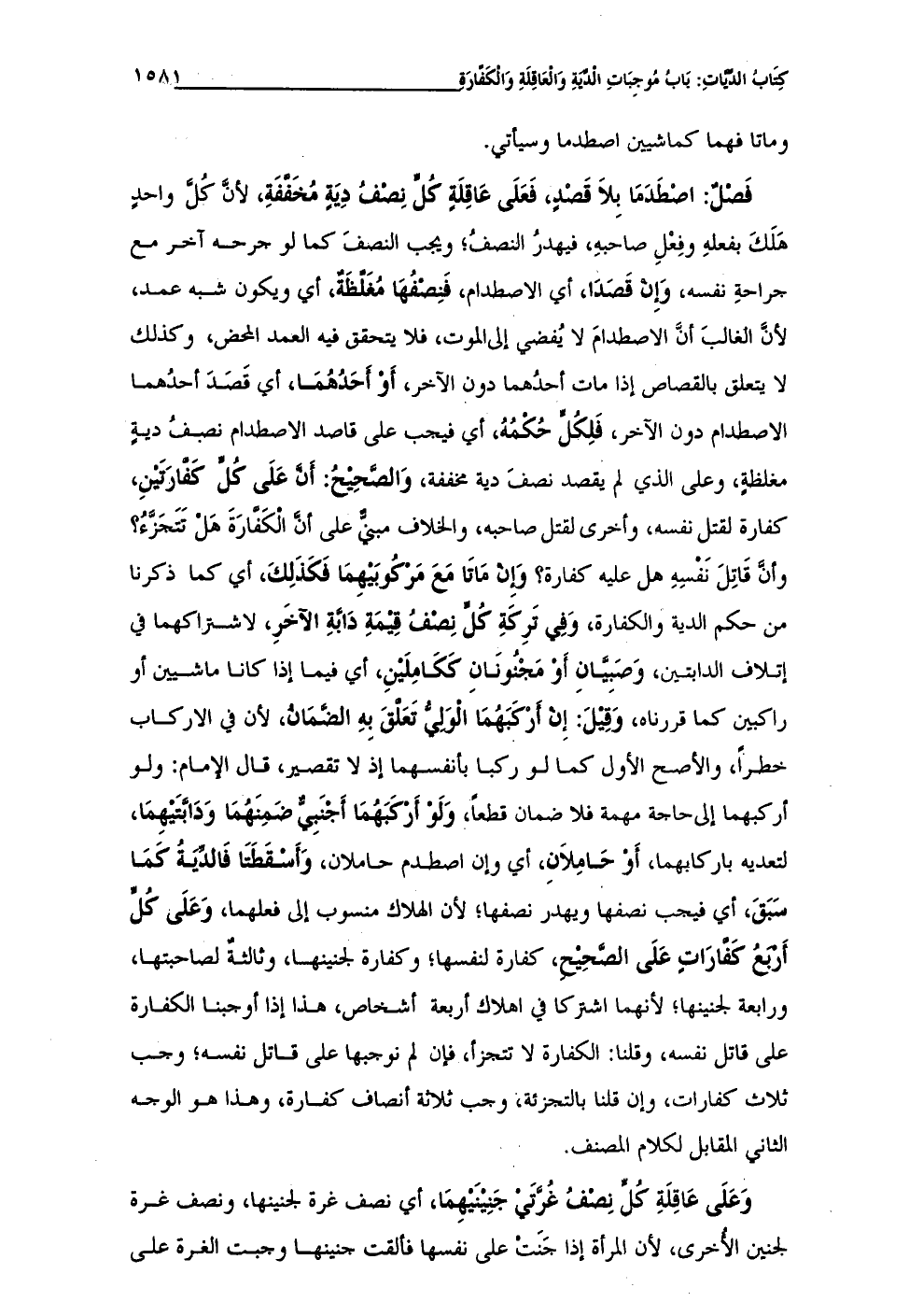 فصل: اصْطَدَمَا بِلَا قَصْدٍ، فَعَلَى عَاقِلَةٍ كُلِّ نِصْفُ دِيَةٍ مُخَفَّفَةِ، لأنَّ كُلِّ واحدٍ هَلَكَ بفعلهِ وفِعْلِ صاحبهِ، فيهدرُ النصفُ؛ ويجب النصفَ كما لو جرحه آخر مع جراحةِ نفسه، وَإِن قَصَدَا، أي الاصطدام، فَنِصْفُهَا مُغَلَّظَة، أي ويكون شبه عمد، لأنَّ الغالبَ أنَّ الاصطدامَ لا يُفضي إلى الموت، فلا يتحقق فيه العمد المحض، وكذلك لا يتعلق بالقصاص إذا مات أحدُهما دون الآخر، أَوْ أحَدُهُمَا، أي قَصَدَ أحدُهما الاصطدام دون الآخر، فَلِكُلٍّ حُكْمُهُ، أي فيجب على قاصد الاصطدام نصفُ ديةٍ مغلظة، وعلى الذي لم يقصد نصفَ دية مخففة، وَالصَّحِيحُ: أنَّ عَلَى كُل كَفَّارتين، كفارة لقتل نفسه، وأخرى لقتل صاحبه، والخلاف مبنيّ على أن الكَفارَةَ هَلْ تَتَجزَّءُ؟ وأنَّ قَاتِلَ نَفْسِهِ هل عليه كفارة؟ وَإن مَاتَا مَعَ مَركُوبَيهِمَا فكَذَلِكَ، أي كما ذكرنا من حكم الدية والكفارة، وَفِي تَرِكَه كُل نِصفُ قِيمَةِ دَابَّةِ الآخَرِ، لاشتراكهما في إتلاف الدابتين، وَصَبيَّانِ أَوْ مَجْنونَانِ ككَامِلَينِ، أي فيما إذا كانا ماشيين أو راكبين كما قررناه، وَقِيلَ: إِن أرْكَبَهُمَا الوَليُّ تَعَلقَ بِهِ الضَّمان، لأنَّ في الاركاب خطرًا، والأصح الأول كما لو ركبا بأنفسهما إذ لا تقصير، قال الإمام: ولو أركبهما إلى حاجة مهمة فلا ضمان قطعًا، وَلَوْ أَركَبَهُمَا أَجنَبِي ضَمِنَهُمَا وَدَابَّتيهِمَا، لتعديه بأركابهما، أَوْ حَامِلَانِ، أي وإن اصطدم حاملان، وَأَسقَطتا فالدِّية كما سبَقَ، أي فيجب نصفها ويهدر نصفها؛ لأنَّ الهلاك منسوب إلى فعلهما، وَعَلَى كُلٍّ أَربعُ كَفَّارَاتِ عَلَى الصَّحيح، كفارة لنفسها؛ وكفارة لجنينها، وثالثةٌ لصاحبتها، ورابعة لجنينها؛ لأنهما اشتركا في إهلاك أربعة أشخاص، هذا إذا أوجبنا الكفارة على قاتل نفسه، وقلنا: الكفارة لا تتجزأ، فإن لم نوجبها على قاتل نفسه؛ وجب ثلاث كفارات، وإن قلنا بالتجزئة، وجب ثلاثة أنصاف كفارة، وهذا هو الوجه الثَّاني المقابل لكلام المصنف.