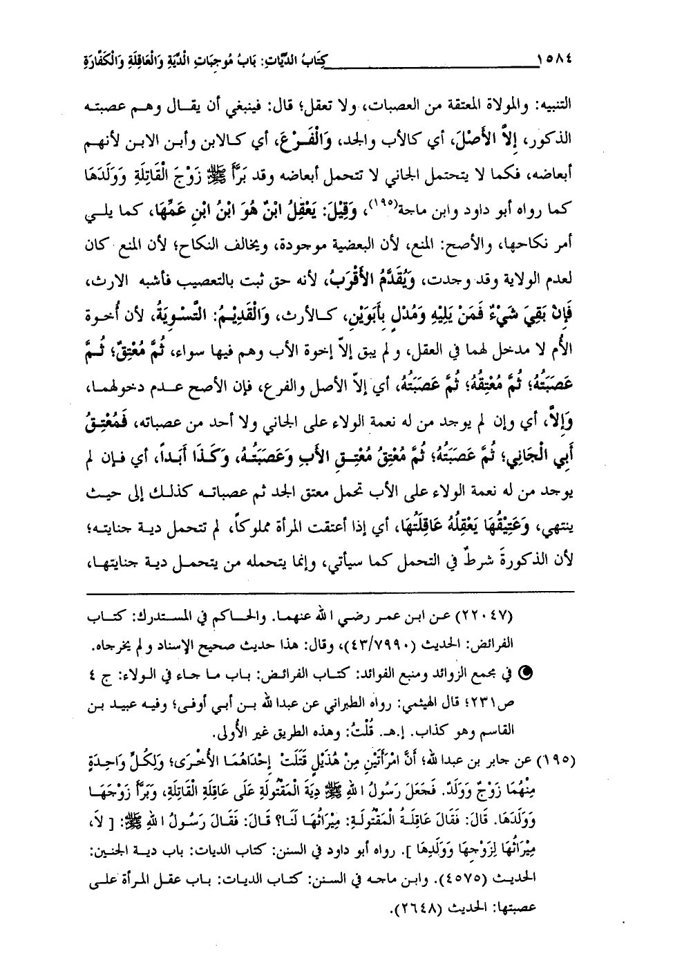 التنبيه: والمولاة المعتقة من العصبات، ولا تعقل؛ قال: فينبغي أن يقال وهم عصبته الذكور، إِلَّا الأصْلَ، أي كالأب والجد، وَالفَرعَ، أي كالابن وابن الابن لأنهم أبعاضه، فكما لا يتحمل الجاني لا تتحمل أبعاضه وقد بَرأ - صلى الله عليه وسلم - زَوجَ القَاتِلَةِ وَوَلَدَهَا كما رواه أبو داود وابن ماجه (¬195)، وَقِيلَ: يَعقلُ ابْن هُوَ ابنُ ابن عَمِّهَا، كما يلي أمر نكاحها، والأصح: المنع، لأنَّ البعضية موجودة، ويخالف النكاح؛ لأنَّ المنع كان لعدم الولاية وقد وجدت، ويقَدَّمُ الأقْرَبُ، لأنَّه حق ثبت بالتعصيب فأشبه الإرث، فَإن بَقِيَ شَيْءٌ فَمَنْ يَلِيهِ وَمُدلٍ بِأبَوَينِ، كالإرث، وَالقَدِيمُ: التسوِيَةُ، لأنَّ أخوة الأم لا مدخل لهما في العقل، ولم يبق إلَّا إخوة الأب وهم فيها سواء، ثُمَّ مُعْتِق؛ ثم عَصبَتُهُ؛ ثُمَّ مُعْتِقُهُ؛ ثُمَّ عَصَبَتُهُ، أي إلّا الأصل والفرع، فإن الأصح عدم دخولهما، وَإلا، أي وإن لم يوجد من له نعمة الولاء على الجاني ولا أحد من عصباته، فَمُعتِقُ أَبِي الجَانِي؛ ثُمَّ عَصَبَتُهُ؛ ثُمَّ مُعْتِقُ مُعْتِقِ الأبِ وَعَصَبَتُهُ، وَكَذَا أَبَدا، أي فإن لم يوجد من له نعمة الولاء على الأب تحمل معتق الجد ثم عصباته كذلك إلى حيث ينتهي، وَعَتِيْقُهَا يَعْقِلُهُ عَاقِلَتُهَا، أي إذا أعتقت المرأة مملوكًا، لم تتحمل دية جنايته؛ لأنَّ الذكورةَ شرط في التحمل كما سيأتي، وإنَّما يتحمله من يتحمل دية جنايتها،