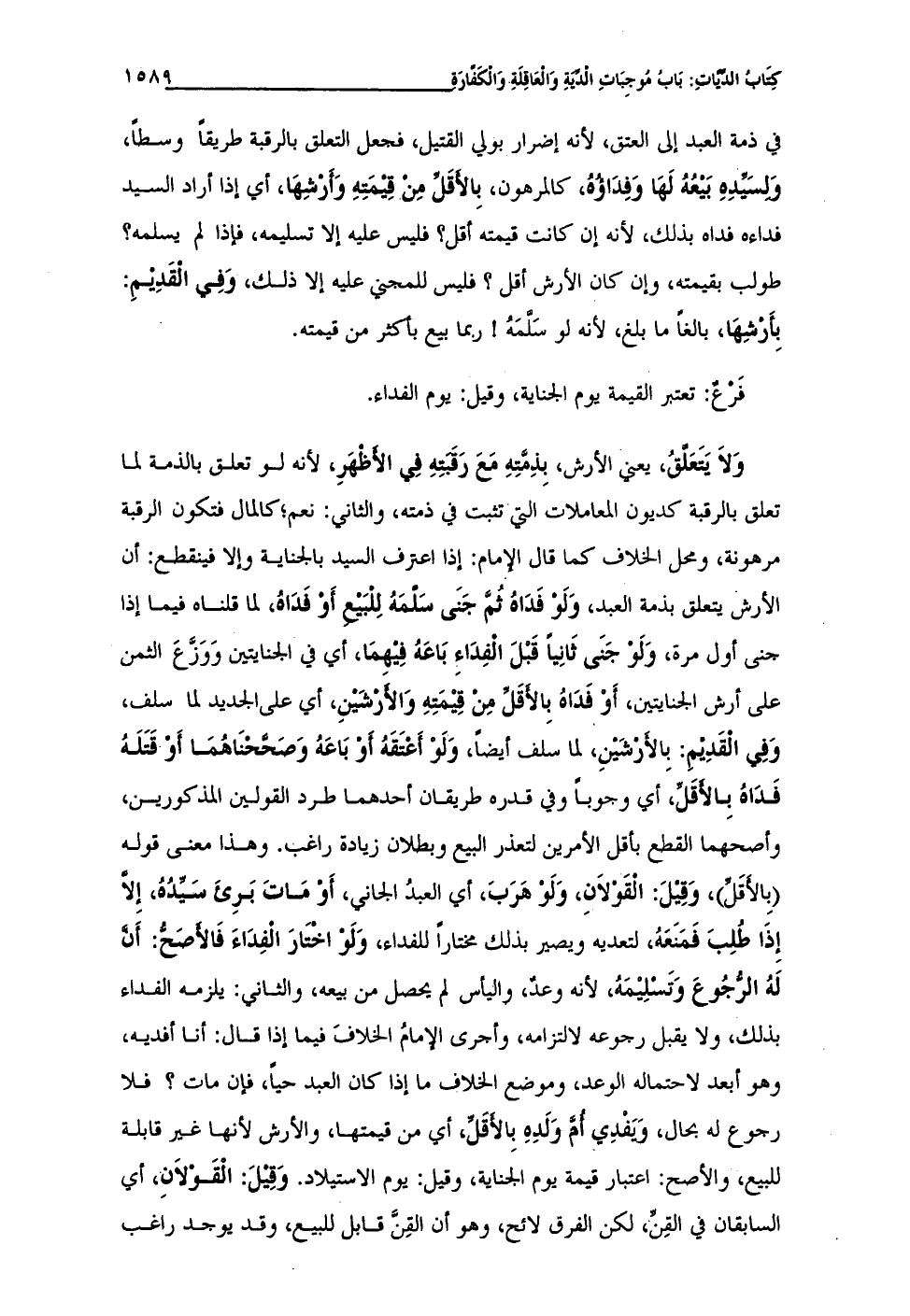 في ذمة العبد إلى العتق، لأنه إضرار بولي القتيل، فجعل التعلق بالرقبة طريقًا وسطًا، وَلسَيِّدِهِ بَيْعُهُ لَها وَفِدَاؤُهُ، كالمرهون، بِالأقَل مِنْ قِيْمَتِهِ وَأرشها، أي إذا أراد السيد فداءه فداه بذلك، لأنه إن كانت قيمته أقل؟ فليس عليه إلا تسليمه، فإذا لم يسلمه؟ طولب بقيمته، وإن كان الأرش أقل؟ فليس للمجني عليه إلا ذلك، وَفِي القَدِيمِ: بأرشها، بالغًا ما بلغ، لأنه لو سَلَّمَه! ربما بيع بأكثر من قيمته.