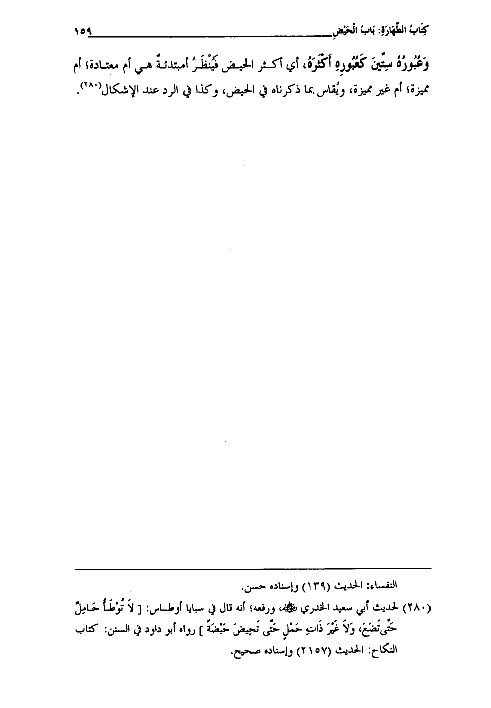 (¬280) لحديث أبي سعيد الخدري - صلى الله عليه وسلم -، ورفعه؛ أنَّه قال في سبايا أوطاس: [لاَ تُوْطَأُ حَامِلٌ حَتَّى تَضَعَ، وَلَا غَيْرَ ذَاتِ حَمْلٍ حَتَّى تَحِيضَ حَيْضَةً] رواه أبو داود في السنن: كتاب النكاح: الحديث (2157) وإسناده صحيح.