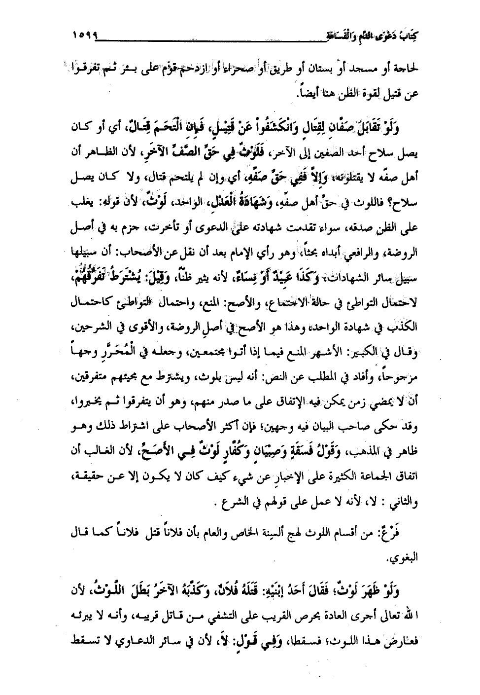 وَلَوْ تَقَابَلَ صَفَّانِ لِقِتَالٍ وَانْكشَفُواْ عَن قَتِيْلٍ، فَإِن الْتَحَمَ قِتَالٌ، أي أو كان يصل سلاح أحد الصفين إلى الآخر، فَلَوْثٌ فِي حَقِّ الصَّفِّ الآخَرِ، لأن الظاهر أن أهل صفّه لا يقتلونه، وإِلا فَفِي حَقِّ صَفَّهِ، أي وإن لم يلتحم قتال، ولا كان يصل سلاح؟ فاللوث في حقِّ أهل صفِّهِ، وَشَهَادَةُ الْعَدْلِ، الواحد، لَوْثٌ، لأن قوله: يغلب على الظن صدقه، سواء تقدمت شهادته على الدعوى أو تأخرت، جزم به في أصل الروضة، والرافعي أبداه بحثًا، وهو رأي الإمام بعد أن نقل عن الأصحاب: أن سبيلها سبيل سائر الشهادات، وَكَذَا عَبيْدٌ أَوْ نِسَاءٌ، لأنه يثير ظَنًا، وَقِيْلَ: يُشْتَرَطُ تَفَرَّقُهُمْ، لاحتمال التواطئ في حالة الاجتماع، والأصح: المنع، واحتمال التواطئ كاحتمال الكذب في شهادة الواحد، وهذا هو الأصح في أصلِ الروضة، والأقوى في الشرحين، وقال في الكبير: الأشهر المنع فيما إذا أتوا مجتمعين، وجعله في الْمُحَرَّرِ وجهًا مرجوحًا، وأفاد في المطلب عن النص: أنه ليس بلوث، ويشترط مع مجيئهم متفرقين، أن لا يمضي زمن يمكن فيه الإتفاق على ما صدر منهم، وهو أن يتفرقوا ثم يخيروا، وقد حكى صاحب البيان فيه وجهين؛ فإن أكثر الأصحاب على اشتراط ذلك وهو ظاهر في المذهب، وَقَوْلُ فَسَقَةٍ وَصبْيَانِ وَكُفَّارٍ لَوْثٌ فِي الأصَحِّ، لأن الغالب أن اتفاق الجماعة الكثيرة على الإخبارِ عن شيء كيف كان لا يكون إلا عن حقيقة، والثاني: لا، لأنه لا عمل على قولهم في الشرع.