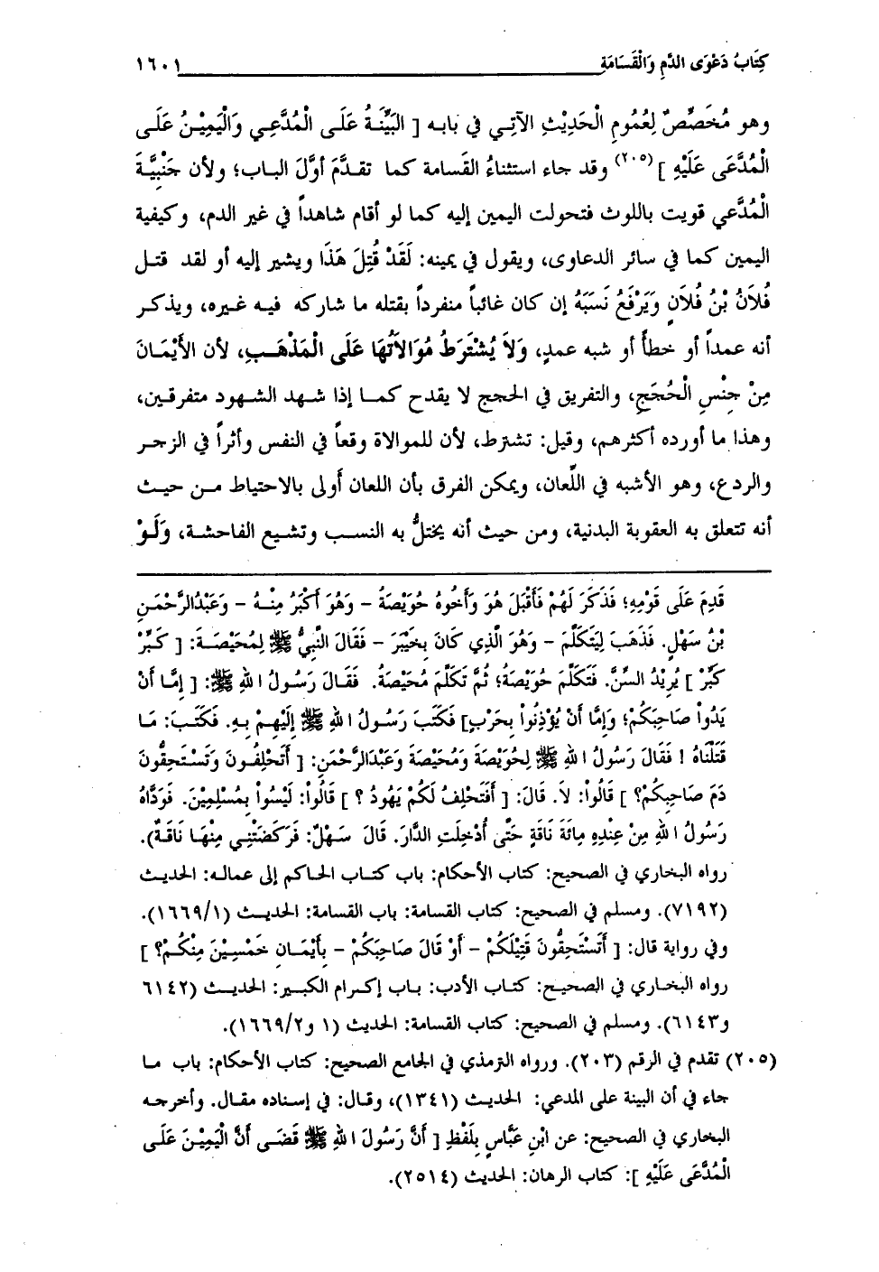 قَدِمَ عَلَى قوْمِهِ؛ فَذَكَرَ لَهُمْ فَأَقْبَل هُوَ وَأخُوهُ حُوَيْصَةُ -وَهُوَ أَكْبَرُ مِنْهُ- وَعَبْدُ الرَّحْمَنِ بْنُ سَهْلٍ. فَذَهَبَ لِيَتَكَلَّمَ -وَهُوَ الَّذِي كَانَ بِخَيْبَرَ- فَقَالَ النَّبيُّ - صلى الله عليه وسلم - لِمُحَيْصَةَ: [كَبِّرْ كّبِّرْ] يُرِيْدُ السِّنَّ. فَتَكَلَّمَ حُوَيْصَةُ؛ ثُمَّ تَكَلَّمَ مُحَيْصَةُ. فَقَالَ رَسُولُ اللهِ - صلى الله عليه وسلم -: [إِمَّا أنْ يَدُوا صَاحِبَكُمْ؛ وَإِمَّا أنْ يُؤْذِنُواْ بِحَرْبٍ] فَكَتَبَ رَسُولُ اللهِ - صلى الله عليه وسلم - إِلَيْهِمْ بهِ. فَكَتَبَ: مَا قَتَلناهُ! فَقَالَ رَسُولُ اللهِ - صلى الله عليه وسلم - لِحُوَيْصَةَ وَمُحَيْصَةَ وَعَبْدَ الرَّحْمَنِ: [أتَحلِفُونَ وَتَسْتَحِقُّونَ دَمَ صَاحِبِكُمْ؟ ] قَالُواْ: لَا. قَالَ: [أفَتَحْلِفُ لَكُمْ يَهُودُ؟ ] قَالُواْ: لَيْسُواْ بِمُسْلِمِيْنَ. فوَدَّاهُ رَسُولُ الله مِن عِنْدِهِ مِائَةَ نَاقَةٍ حَتَّى أُدْخِلَتِ الدَّارَ. قَالَ سَهْلٌ: فَرَكَضَتْنِى مِنْهَا نَاقَةٌ). رواه البخاري في الصحيح: كتاب الأحكام: باب كتاب الحاكم إلى عماله: الحديث (7192). ومسلم في الصحيح: كتاب القسامة: باب القسامة: الحديث (1/ 1669). وفي رواية قال: [أتَسْتَحِقُّونَ قَتِيْلَكُمْ -أوْ قَالَ صَاحِبَكُمْ- بأَيْمَان خَمْسِيْنَ مِنْكُمْ؟ ] رواه البخاري في الصحيح: كتاب الأدب: باب إكرام الكبير: الحديث (6142 و 6143). ومسلم في الصحيح: كتاب القسامة: الحديث (1 و 2/ 1669).