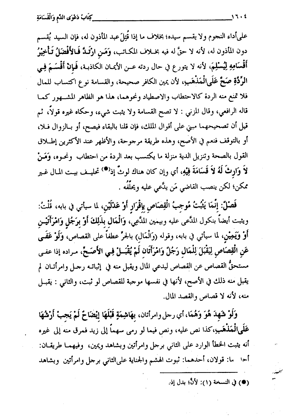 على أداء النجوم ولا يقسم سيده؛ بخلاف ما إذا قُتِلَ عبد المأذون له، فإن السيد يُقسم دون المأذون له، لأنه لا حقَّ له فيه بخلاف المكاتب، وَمَنِ ارْتَدَّ فَالأفْضَلُ تَأْخِيْرُ أَقسَامِهِ لِيُسْلِمَ، لأنه لا يتورع في حال ردته عن الأيمان الكاذبة، فَإِنْ أقْسَمَ فِي الرِّدَّةِ صَحَّ عَلَى الْمَذْهَبِ، لأن يمين الكافر صحيحة، والقسامة نوع اكتساب للمال فلا تمتع منه الردة كالاحتطاب والاصطياد ونحوهما، هذا هو الظاهر المشهور كما قاله الرافعى، وقال المزني: لا تصح القسامة ولا يثبت شيء، وحكاه غيره قولًا، ثم قيل أن تصحيحهما مبني على أقوال الملك، فإن قلنا بالبقاء فيصح، أو بالزوال فلا، أو بالتوقف فنعم في الأصح، وهذه طريقة مرجوحة، والأظهر عند الأكثرين إطلاق القول بالصحة وتنزيل الدية منزلة ما يكتسب بعد الردة من احتطاب ونحوه، وَمَنْ لَا وَارِثَ لَهُ لَا قَسَامَةَ فِيْهِ، أي وإن كان هناك لوثٌ إذ (•) تحليف بيت المال غير ممكن؛ لكن ينصب القاضي مَن يدَّعي عليه ويحلِّفُه.