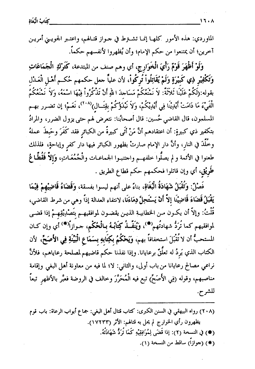 (¬208) رواه البيهقي في السنن الكبرى: كتاب قتال أهل البغي: جماع أبواب الرعاة: باب قوم يظهرون رأي الخوارج لم يحل به قتالهم: الأثر (17233).
