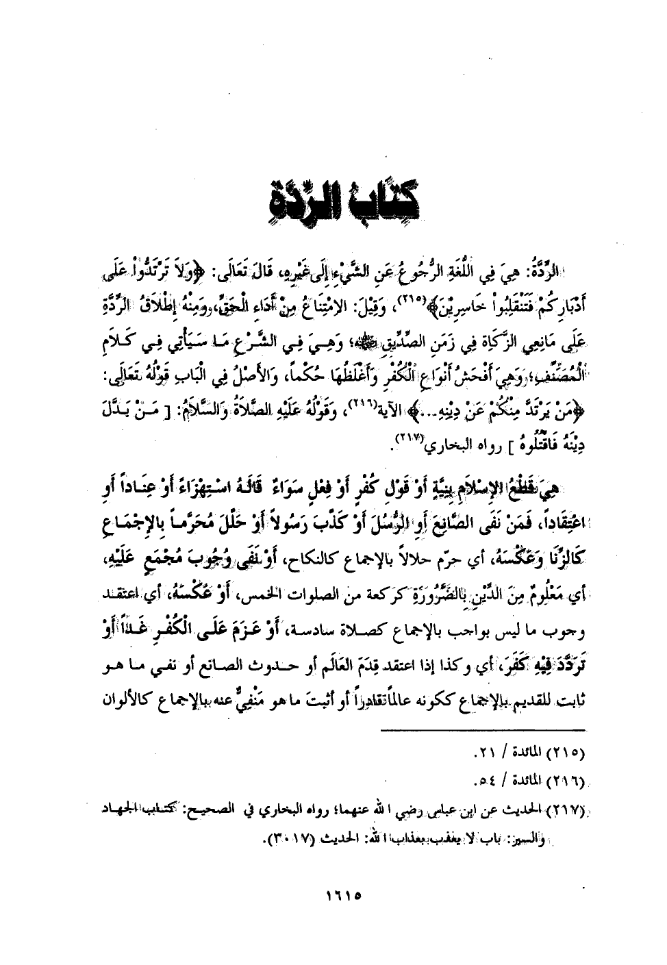 الرِّدَّةُ: هِيَ في اللُّغَةِ، الرُّجُوعُ عَنِ الشَّيْءِ إِلَى غَيْرِهِ، قَالَ تَعَالَى: {وَلَا تَرْتَدُّوا عَلَى أَدْبَارِكُمْ فَتَنْقَلِبُوا خَاسِرِينَ} (¬215)، وَقِيْلَ: الإِمْتِنَاعُ مِنْ أَدَاءِ الْحَقِّ، وَمِنْهُ إِطْلَاقُ الرِّدَّةِ عَلَى مَانِعِي الزَّكَاِة في زَمَنِ الصِّدّيقِ - رضي الله عنه -؛ وَهِيَ فِي الشَّرْعِ مَا سَيَأْتِي في كَلَامِ الْمُصَنفِ؛ وَهِيَ أفْحَشُ أَنْوَاعِ الْكُفْرِ وَأَغْلَظُهَا حُكْمًا، وَالأَصْلُ في الْبَابِ قَوْلُهُ تَعَالَى: {مَنْ يَرْتَدَّ مِنْكُمْ عَنْ دِينِهِ. . .} الآية (¬216)، وَقَوْلُهُ -عَلَيْهِ الصَّلَاةُ وَالسَّلَامُ-: [مَنْ بَدَّلَ دِيْنَهُ فَاقْتُلُوهُ] رواه البخاري (¬217).