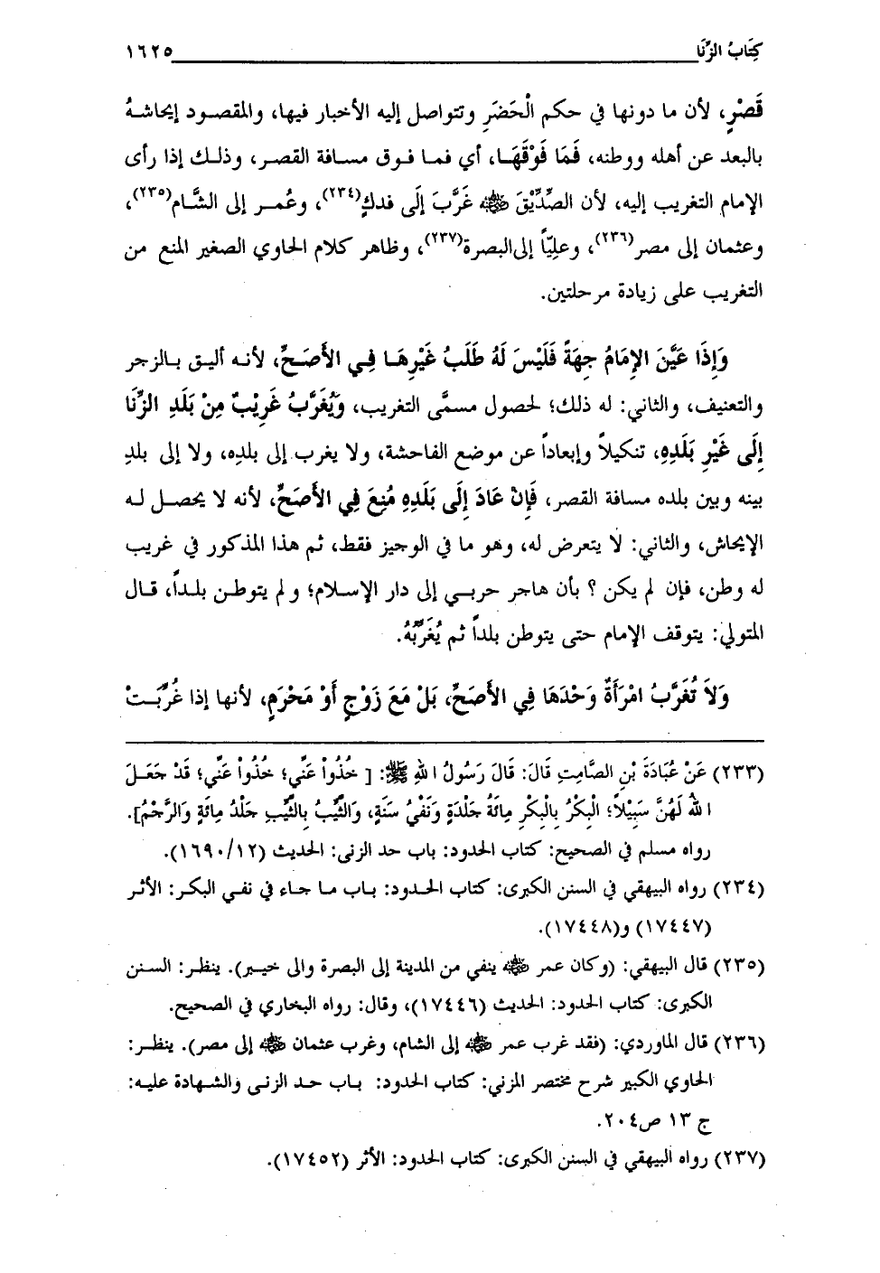 (¬236) قال الماوردي: (فقد غرب عمر - رضي الله عنه - إلى الشام، وغرب عثمان - رضي الله عنه - إلى مصر). ينظر: الحاوي الكبير شرح مختصر المزني: كتاب الحدود: باب حد الزنى والشهادة عليه: ج 13 ص 204.