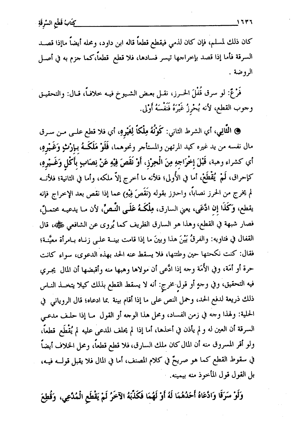 • الثَّانِي، أي الشرط الثاني: كَوْنُهُ مِلْكًا لِغَيْرِهِ، أي فلا قطع على من سرق مال نفسه من يد غيره كيد المرتهن والمستأجر ونحوهما، فَلَوْ مَلَكَهُ بِإِرْثٍ وَغَيْرِهِ، أي كشراء وهبة، قَبْلَ إِخْرَاجِهِ مِنَ الحِرْزِ، أَوْ نَقَصَ فِيْهِ عَنْ نِصَابٍ بِأَكْلٍ وَغَيْرِهِ، كإحراق، لم يُقْطَعْ، أما في الأُولى؛ فلأنه ما أخرج إلّا ملكه، وأما في الثانية؛ فلأنه لم يخرج من الحرز نصابًا، واحترز بقوله (نَقَصَ فِيْهِ) عما إذا نقص بعد الإخراج فإنه يقطع، وَكَذَا إِنِ ادَّعَى، يعني السارق، مِلْكَهُ عَلَى النَّصِّ، لأن ما يدعيه محتملٌ، فصار شبهة في القطع، وهذا هو السارق الظريف كما يُروى عن الشافعي - رضي الله عنه -، قال القفال في فتاويه: والفرقُ بَيْنَ هذا وبينَ ما إذا قامت بينة على زناه بامرأة معيَّنة؛ فقال: كنت نكحتها حين وطئتها، فلا يسقط عنه الحد بهذه الدعوى، سواء كانت حرة أو أمَة، وفي الأَمَة وجه إذا ادَّعى أن مولاها وهبها منه وأقبضها أن المال يجري فيه التحقيق، وفي وجهٍ أو قولٍ مخرجٍ: أنه لا يسقط القطع بذلك كيلا يتخذ الناس ذلك ذريعة لدفع الحد، وحمل النص على ما إذا أقام بينة بما ادعاه؛ قال الروياني في الحلية: ولهذا وجه في زمن الفساد، ومحل هذا الوجه أو القول ما إذا حلف مدعي السرقة أن العين له ولم يأذن في أخذها، أما إذا لم يحلف المدعى عليه لم يُقْطَع قطعًا، ولو أقر المسروق منه أن المال كان ملك السارق، فلا قطع قطعًا، ومحل الخلاف أيضًا في سقوط القطع كما هو صريحٌ في كلام المصنف، أما في المال فلا يقبل قوله فيه، بل القول قول المأخوذ منه بيمينه.
