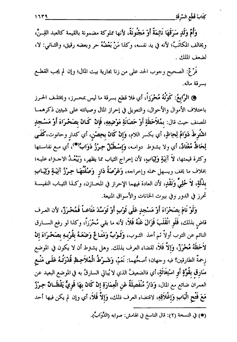 وَلَوْ نَامَ بِصَحْرَاءَ أَوْ مَسْجِدٍ عَلَى ثَوْبٍ أَوْ تَوَسَّدَ مَتَاعًا فَمُحْرَزٌ، لأن العرف قاضٍ بذلك، فَلَوِ انْقَلَبَ فزَالَ عَنْهُ فَلاَ، لأنه ما بقي مُحْرَزًا، وكذا لو رفع السارق النائم عن الثوب أولاً ثم أخذ الثوب، وَثَوْبٌ وَمَتَاعٌ وَضَعَهُ بِقُرْبِهِ بِصَحْرَاءَ إِنْ لاَحَظَهُ مُحْرَزٌ، وَإِلَّا فَلاَ، لقضاء العرف بذلك. وهل يشترط أن لا يكون في الموضع زِحمةٌ الطارقين؟ فيه وجهان؛ أصحُّهما: نَعَمْ، وَشَرْطُ الْمُلاَحِظِ قُدْرَتُهُ عَلَى مَنْعِ سَارِقٍ بِقُوَّةٍ أَوِ اسْتِغَاثَةٍ، أي فالضعيفُ الذي لا يُبالي السارقُ به في الموضع البعيد عن العمران ضائع مع المال، وَدَارٌ مُنْفَصِلَةٌ عَنِ الْعِمَارَةِ إِنْ كاَنَ بِهَا قَوِيٌّ يَقْظَانٌ حِرْزٌ مَعَ فَتْحِ الْبَابِ وَإِغْلاَقِهِ لاقتضاء العرف ذلك، وَإِلاَّ فَلاَ، أي وإن لم يكن فيها أحد
