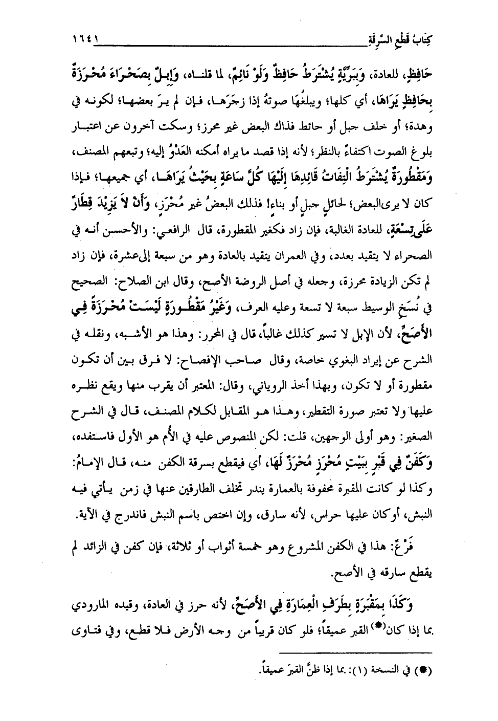 حَافِظٍ، للعادة، وَبِبَرَّيَّةٍ يُشْتَرَطُ حَافِظٌ وَلَوْ نَائِمٌ، لما قلناه، وَإِبِلٌ بِصَحْرَاءَ مُحْرَزَةٌ بِحَافِظٍ يَرَاهَا، أي كلها؛ ويبلغُهَا صوتهُ إذا زجَرَها، فإن لم يرَ بعضها؛ لكونه في وهدة؛ أو خلف جبل أو حائط فذاك البعض غير محرز؛ وسكت آخرون عن اعتبار بلوغ الصوت اكتفاءً بالنظر؛ لأنه إذا قصد ما يراه أمكنه العَدْوُ إليه؛ وتبعهم المصنف، وَمَقْطُورَةٌ يُشْتَرَطُ الْتِفَاتُ قَائِدِهَا إِلَيْهَا كُلَّ سَاعَةٍ بِحَيْثُ يَرَاهَا، أي حميعها؛ فإذا كان لا يرى البعض؛ لحائلٍ جبلٍ أو بناءٍ! فذلك البعضُ غير مُحْرَزٍ، وَأَنْ لاَ يَزِيْدَ قِطَارٌ عَلَى تِسْعَةٍ، للعادة الغالبة، فإن زاد فكغير المقطورة، قال الرافعي: والأحسن أنه في الصحراء لا يتقيد بعدد، وفي العمران يتقيد بالعادة وهو من سبعة إلى عشرة، فإن زاد لم تكن الزيادة محرزة، وجعله في أصل الروضة الأصح، وقال ابن الصلاح: الصحيح في نُسَخِ الوسيط سبعة لا تسعة وعليه العرف، وَغَيْرُ مَقْطُورَةٍ لَيْسَتْ مُحْرَزَةً فِي الأصَحَّ، لأن الإبل لا تسير كذلك غالبًا، قال في المحرر: وهذا هو الأشبه، ونقله في الشرح عن إيراد البغوي خاصة، وقال صاحب الإفصاح: لا فرق بين أن تكون مقطورة أو لا تكون، وبهذا أخذ الروياني، وقال: المعتبر أن يقرب منها ويقع نظره عليها ولا تعتبر صورة التقطير، وهذا هو المقابل لكلام المصنف، قال في الشرح الصغير: وهو أولى الوجهين، قلت: لكن المنصوص عليه فى الأُم هو الأول فاستفده، وَكَفَنٌ فِي قَبْرٍ بِبَيْتٍ مُحْرَزٍ مُحْرَزٌ لَهَا، أي فيقطع بسرقة الكفن منه، قال الإمامُ: وكذا لو كانت المقبرة محفوفة بالعمارة يندر تخلف الطارقين عنها في زمن يأتي فيه النبش، أو كان عليها حراس، لأنه سارق، وإن اختص باسم النبش فاندرج في الآية.