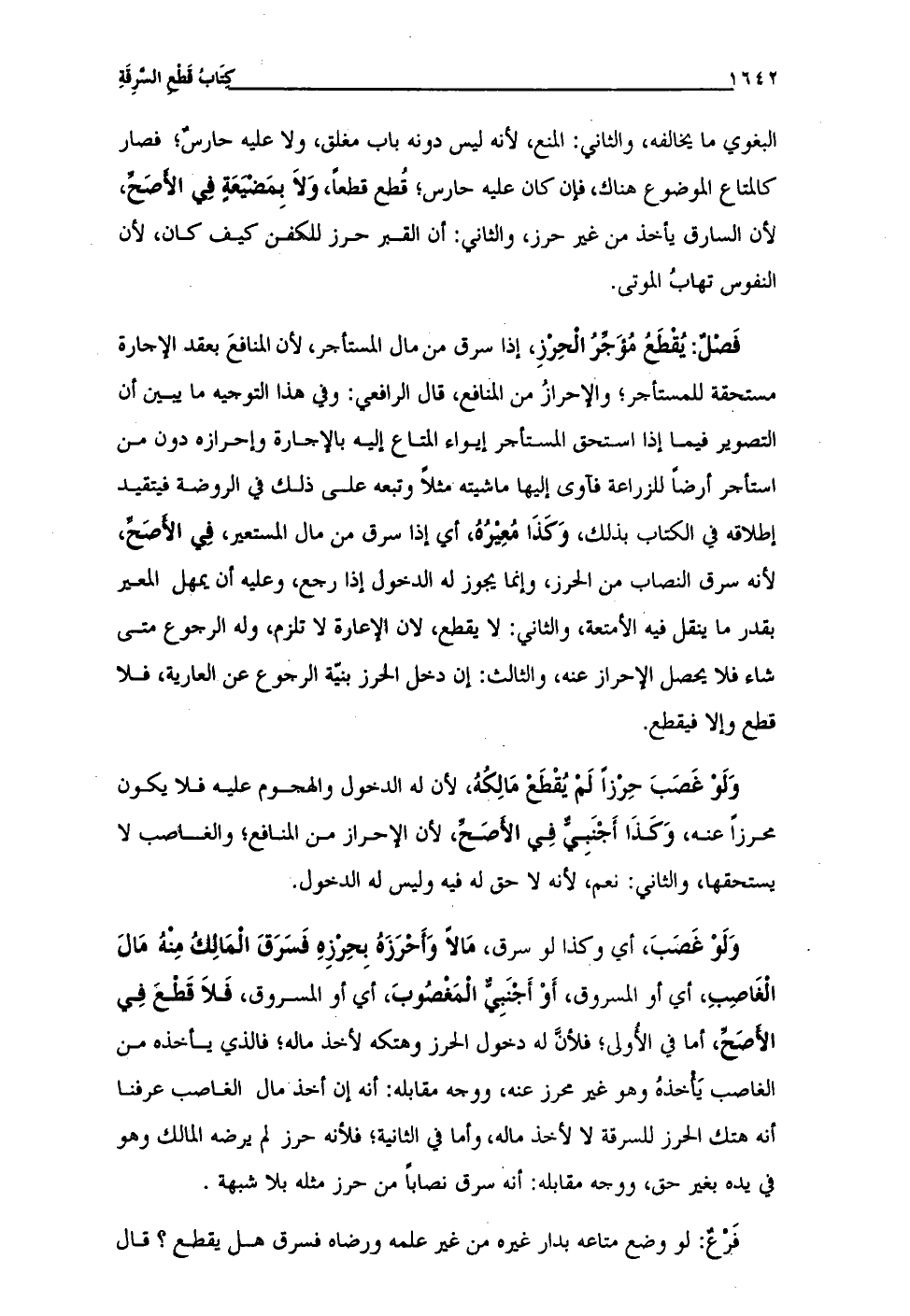 فَصْلٌ: يُقْطَعُ مُؤَجَّرُ الْحِرْزِ، إذا سرق من مال المستأجر، لأن المنافعَ بعقد الإجارة مستحقة للمستأجر؛ والإحرازُ من المنافع، قال الرافعي: وفي هذا التوجيه ما يبين أن التصوير فيما إذا استحق المستأجر إيواء المتاع إليه بالإجارة وإحرازه دون من استأجر أرضًا للزراعة فآوى إليها ماشيته مثلًا وتبعه على ذلك في الروضة فيتقيد إطلاقه في الكتاب بذلك، وَكَذَا مُعِيْرُهُ، أي إذا سرق من مال المستعير، فِي الأَصَحَّ، لأنه سرق النصاب من الحرز، وإنما يجوز له الدخول إذا رجع، وعليه أن يمهل المعير بقدر ما ينقل فيه الأمتعة، والثاني: لا يقطع، لان الإعارة لا تلزم، وله الرجوع متى شاء فلا يحصل الإحراز عنه، والثالث: إن دخل الحرز بنيّة الرجوع عن العارية، فلا قطع وإلا فيقطع.