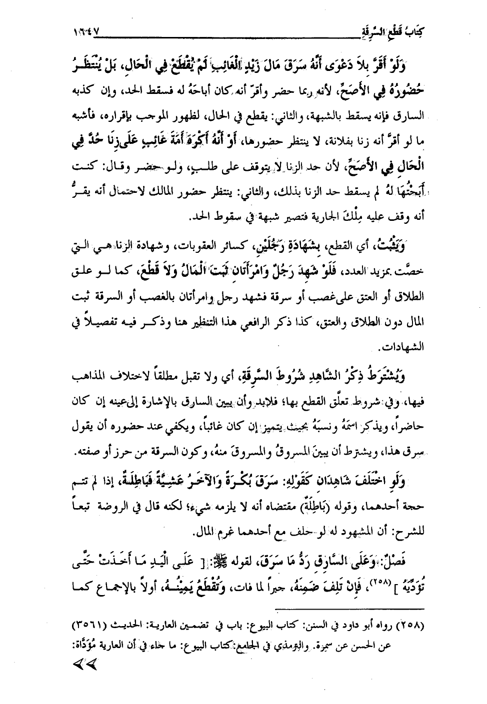 وَيَثْبُتُ، أي القطع، بِشَهَادَةِ رَجُلَيْنِ، كسائر العقوبات، وشهادة الزنا هي التي خصَّت بمزيد العدد، فَلَوْ شَهِدَ رَجُلٌّ وَامْرَأَتَانِ ثَبَتَ الْمَالُ وَلاَ قَطْعَ، كما لو علق الطلاق أو العتق على غصب أو سرقة فشهد رجل وامرأتان بالغصب أو السرقة ثبت المال دون الطلاق والعتق، كذا ذكر الرافعي هذا التنظير هنا وذكر فيه تفصيلاً في الشهادات.