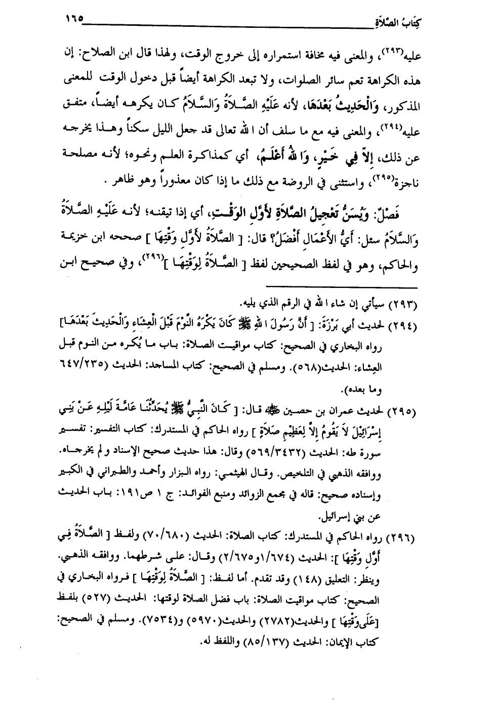 (¬296) رواه الحاكم في المستدرك: كتاب الصلاة: الحديث (680/ 70) ولفظ [الصَّلاَةُ فِي أَوَّلِ وَقْتِهَا]: الحديث (674/ 1 و 675/ 2) وقال: على شرطهما. ووافقه الذهبى.